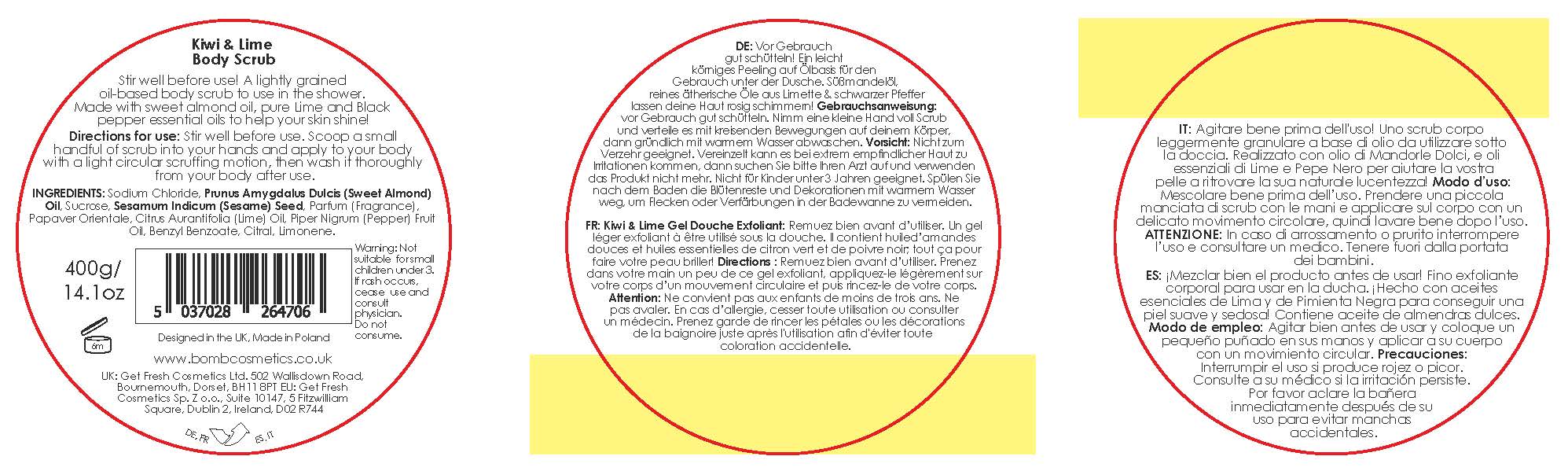 INGREDIENTS: Sodium Chloride, Prunus Amygdalus Dulcis (Sweet Almond) Oil, Sucrose, Sesamum Indicum (Sesame) Seed, Parfum (Fragrance), Papaver Orientale, Citrus Aurantifolia (Lime) Oil, Piper Nigrum (Pepper) Fruit Oil, Benzyl Benzoate, Citral, Limonene.