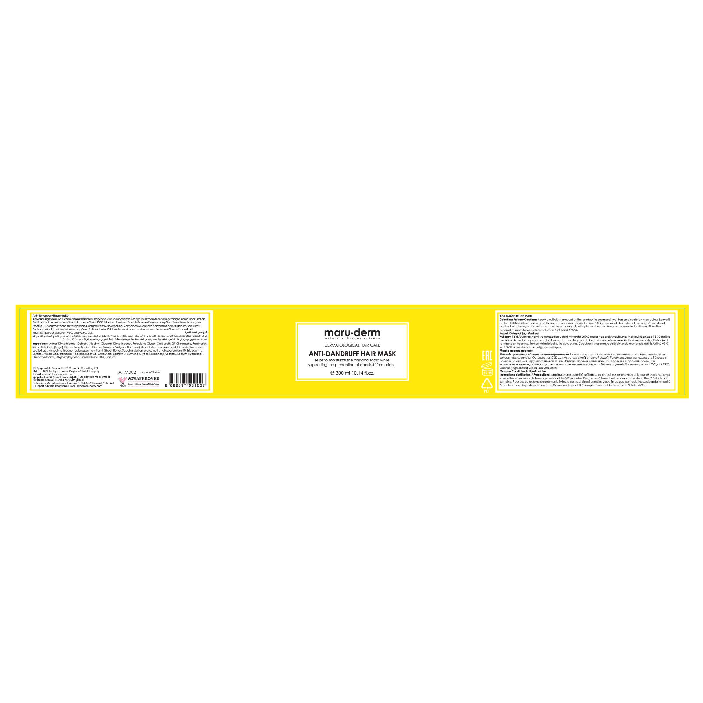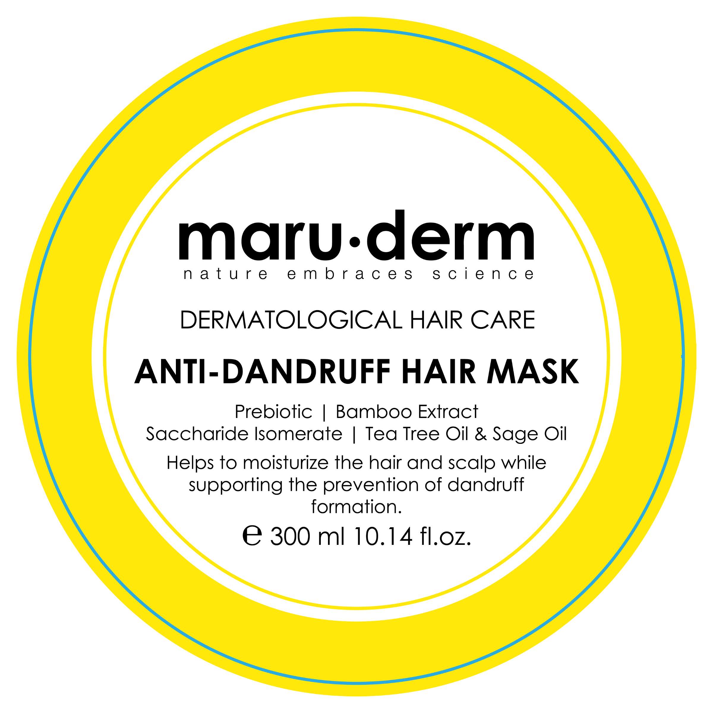 Maruderm Kepek Karşıtı serisi, şampuan, saç kremi, saç maskesi ve saç toniği ürünlerinin birlikte kullanımıyla maksimum etki elde etmeyi hedefler ve kepek sorununu hedef alarak saç ve saç derisinin sağlıklı kalmasını destekler. Maruderm Kepek Önleyici Saç Maskesi, Prebiyotik, Bamboo Ekstraktı, Saccharide Isomerate, Çay Ağacı Yağı ve Adaçayı Yağı gibi özel bileşenlerle zenginleştirilmiş formülüyle saç ve saç derisinin nemlendirilmesine ve kepek oluşumunun önlenmesine yardımcı olurken, saçlara parlak bir görünüm kazandırmayı hedefler.