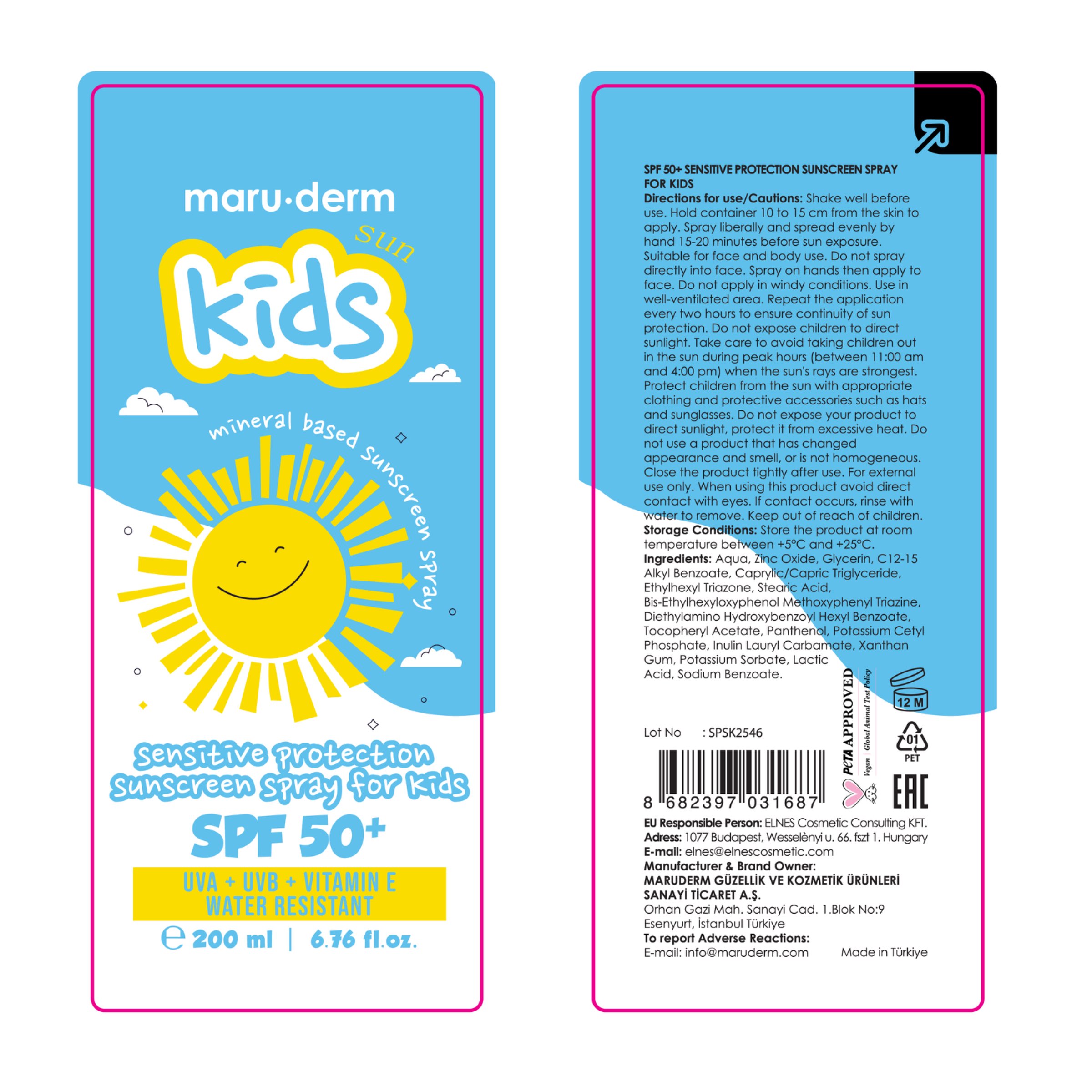 Maruderm SPF 50+ Çocuklar İçin Hassas Koruma Sprey Güneş Kremi, özellikle hassas cilt yapısına sahip çocuklar için özel olarak geliştirilmiş, yüksek koruma sağlayan bir güneş koruyucudur. Hassas ve narin ciltlerin güneşin zararlı UVA ve UVB ışınlarına karşı korunmasına yardımcı olur. Hafif ve ciltle uyumlu formülü sayesinde tahriş riskini en aza indirerek, çocuk cildine nazikçe bakım yapar. Hassas ve güneşe karşı duyarlı cilt yapısına sahip yetişkinler tarafından da tercih edilebilir.