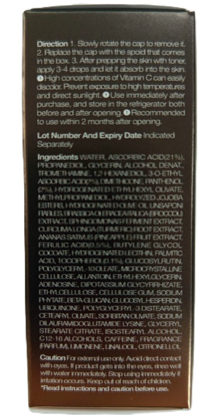 Water, Ascorbic Acid(%21), Propanediol, Glycerin, Alcohol Denat., Tromethamine, 1,2-Hexanediol, 3-O-Ethyl Ascorbic Acid(%2), Dimethicone, Panthenol, Hydrogenated Ethylhexyl Olivate,Methylpropanediol, Hydrolyzed Jojoba Esters, Hydrogenated Olive Oil Unsaponifiables, BrassicaOleracea Italica (Broccoli) Extract, Sphingomonas Ferment Extract, Curcuma Longa (Turmeric) RootExtract, Ananas Sativus (Pineapple) Fruit Extract, Ferulic Acid(%0.5), Butylene Glycol Cocoate,Hydrogenated Lecithin, Palmitic Acid, Tocopherol(%0.1), Glucosylrutin, Polyglyceryl-10 Oleate,Microcrystalline Cellulose, Allantoin, Ethylhexylglycerin, Adenosine, Dipotassium Glycyrrhizate,Ethylcellulose, Cellulose Gum, Sodium Phytate, Beta-Glucan, Glucosyl Hesperidin, Ubiquinone,Polyglyceryl-3 Distearate, Cetearyl Olivate, Sorbitan Olivate, Sodium Dilauramidoglutamide Lysine,Glyceryl Stearate Citrate, Isostearyl Alcohol, C12-16 Alcohols, Caffeine, Fragrance(Parfum),Limonene, Linalool, Citronellol
