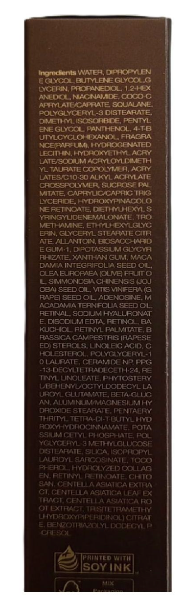 Water, Dipropylene Glycol, Butylene Glycol, Glycerin, Propanediol, 1,2-Hexanediol,Niacinamide, Coco-Caprylate/Caprate, Squalane, Polyglyceryl-3 Distearate, Dimethyl Isosorbide,Pentylene Glycol, Panthenol, 4-t-Butylcyclohexanol, Fragrance(Parfum), Hydrogenated Lecithin,Hydroxyethyl Acrylate/Sodium Acryloyldimethyl Taurate Copolymer, Acrylates/C10-30 Alkyl AcrylateCrosspolymer, Sucrose Palmitate, Caprylic/Capric Triglyceride, Hydroxypinacolone Retinoate,Diethylhexyl Syringylidenemalonate, Tromethamine, Ethylhexylglycerin, Glyceryl Stearate Citrate,Allantoin, Biosaccharide Gum-1, Dipotassium Glycyrrhizate, Xanthan Gum, Macadamia IntegrifoliaSeed Oil, Olea Europaea (Olive) Fruit Oil, Simmondsia Chinensis (Jojoba) Seed Oil, Vitis Vinifera(Grape) Seed Oil, Adenosine, Macadamia Ternifolia Seed Oil, Retinal, Sodium Hyaluronate, DisodiumEDTA, Retinol, Bakuchiol, Retinyl Palmitate, Brassica Campestris (Rapeseed) Sterols, Linoleic Acid,Cholesterol, Polyglyceryl-10 Laurate, Ceramide NP, PPG-13-Decyltetradeceth-24, Retinyl Linoleate,Phytosteryl/Behenyl/Octyldodecyl Lauroyl Glutamate, Beta-Glucan, Aluminum/MagnesiumHydroxide Stearate, Pentaerythrityl Tetra-di-t-butyl Hydroxyhydrocinnamate, Potassium CetylPhosphate, Polyglyceryl-3 Methylglucose Distearate, Silica, Isopropyl Lauroyl Sarcosinate,Tocopherol, Hydrolyzed Collagen, Retinyl Retinoate, Chitosan, Centella Asiatica Extract, CentellaAsiatica Leaf Extract, Centella Asiatica Root Extract, Tris(Tetramethylhydroxypiperidinol) Citrate,Benzotriazolyl Dodecyl p-Cresol