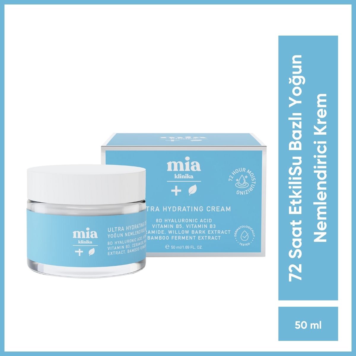 Mia Klinika 72 Saat Etkili Su Bazlı Yoğun Nemlendirici Krem 50 ml, cildi anında nemlendirirken uzun süreli nem dengesi sağlar.