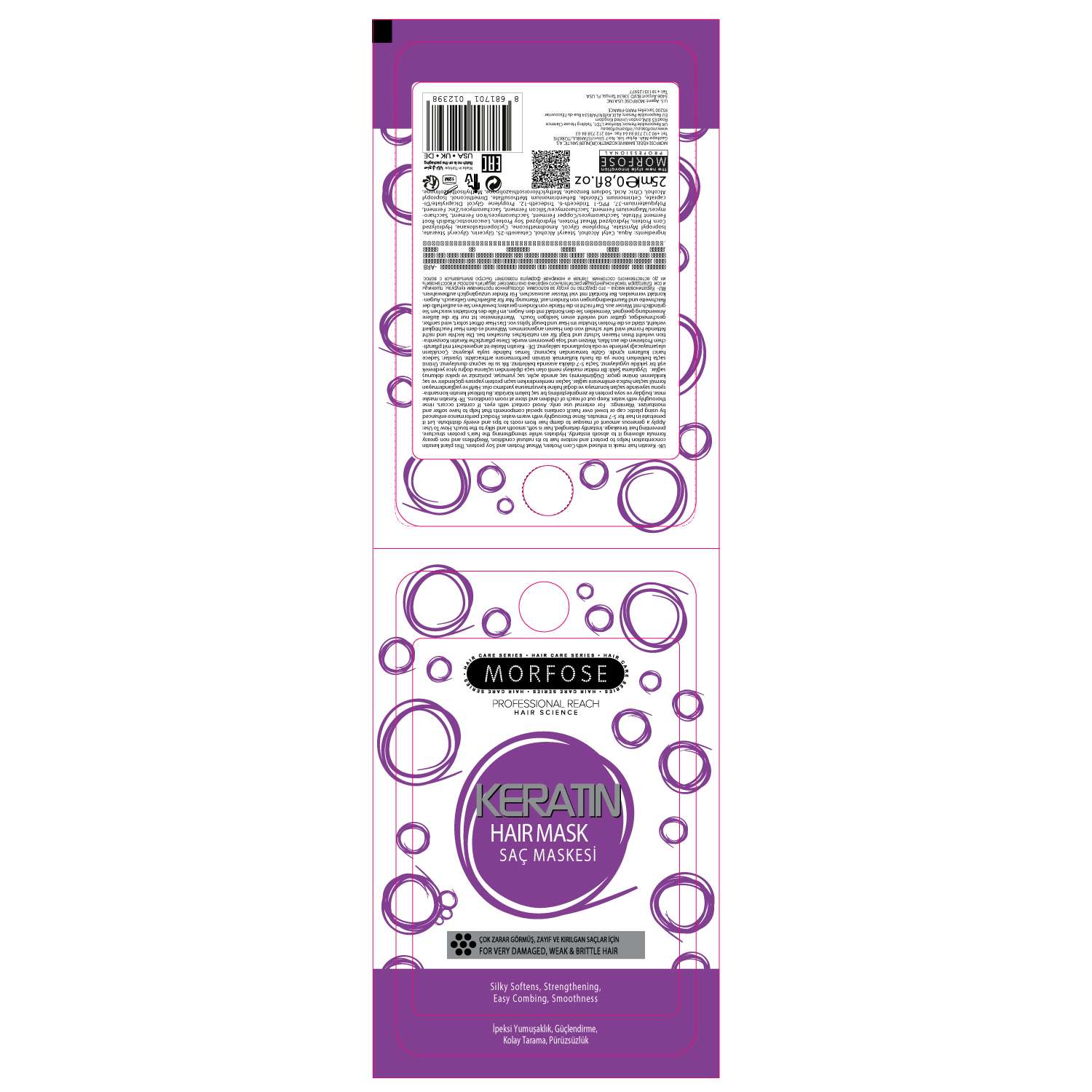 Morfose Bubble Keratin Saç Maskesi çok yıpranmış ve aşırı işlem görmüş saçlar için özel olarak formüle edilmiştir. Buğday, mısır ve soya fasulyesinden elde edilen hidrolize proteinlerden oluşan bitkisel keratinle zenginleştirilmiştir. Saçın neminin artmasına ve ıslakken kolay taranmasına yardımcı olur.