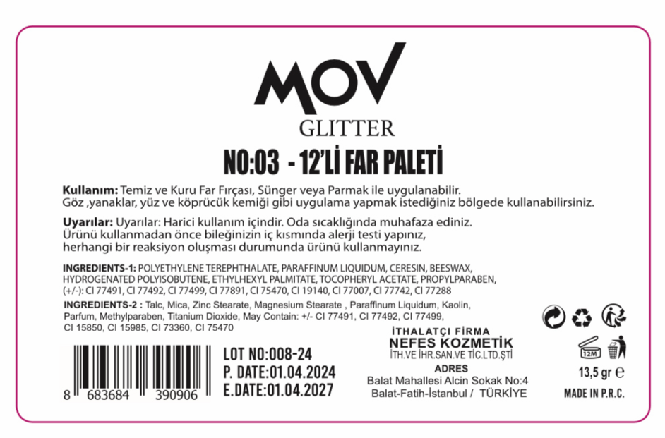 MOV 12li Far Paleti Glitter NO:03 ile yaratıcılığınızı serbest bırakın. On iki farklı tonu ile bu palet, dramatik ve dikkat çekici makyaj görünümleri için ideal. Renkler ve dokularla denemeler yapmayı seven makyaj tutkunları için harika bir seçenek.