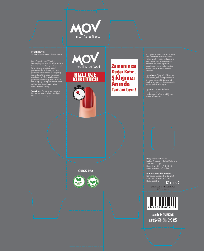 MOV Hızlı Oje Kurutucu Jel, ojenin kuruma süresini hızlandıran etkili formülüyle öne çıkar. Ojeye uygulandığı anda hızlı kuruma sağlar, oje uygulama sürecini pratik hale getirir.