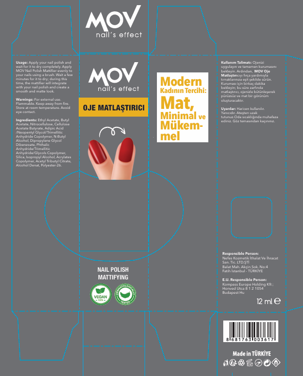 MOV Oje Matlaştırıcı Jel, ojeye uygulandığında tırnaklara mat bir görünüm kazandırır. Modern ve doğal tırnak görünümü isteyenler için mükemmel bir tamamlayıcıdır.