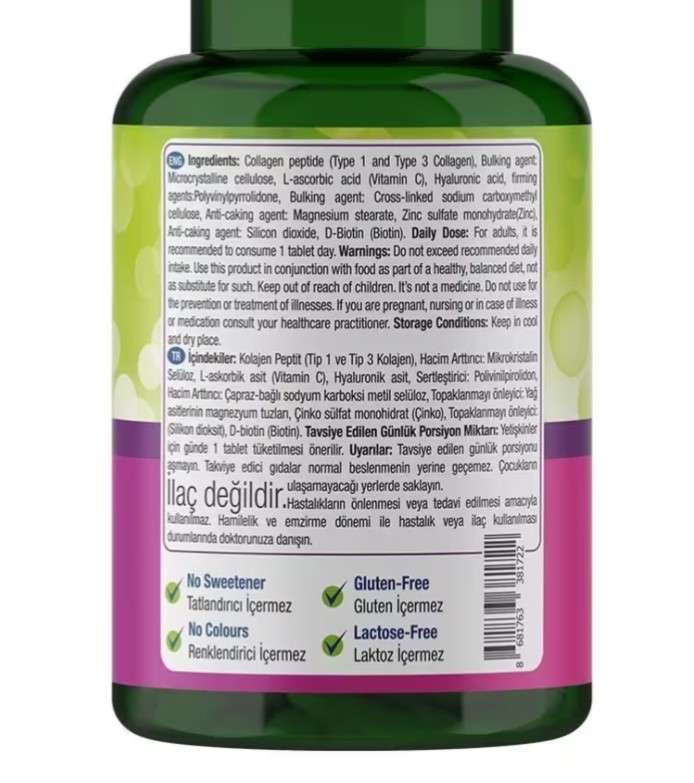 - Tablet başına 1000 mg hidrolize kolajen peptitleri (Tip 1 ve Tip 3)