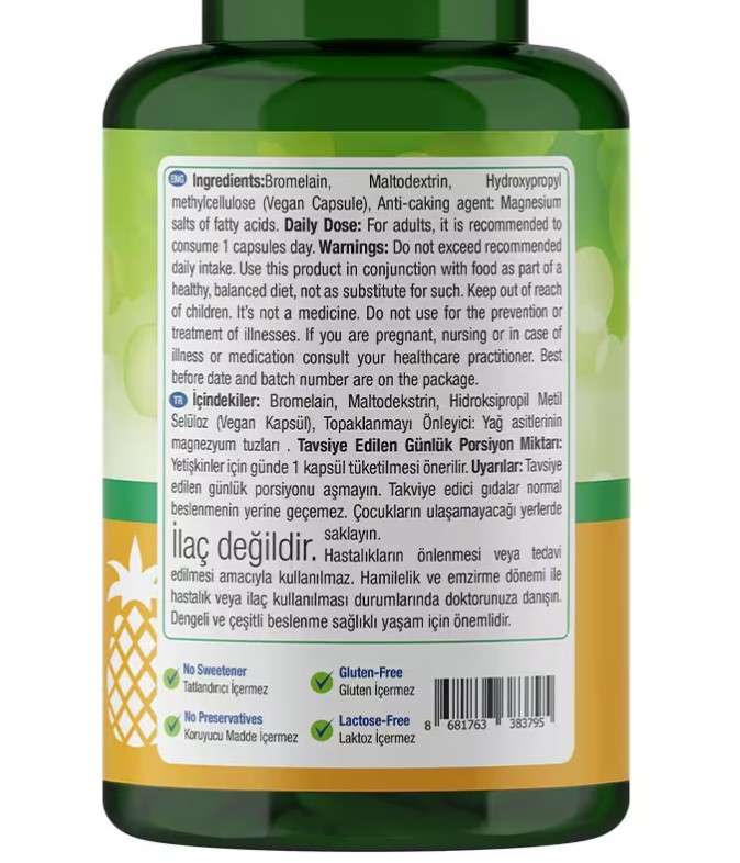 Bromelain, Maltodekstrin, Hidroksipropil metil selüloz(vegan kapsül), topaklanmayı önleyici: yağ asitlerinin magnezyum tuzları