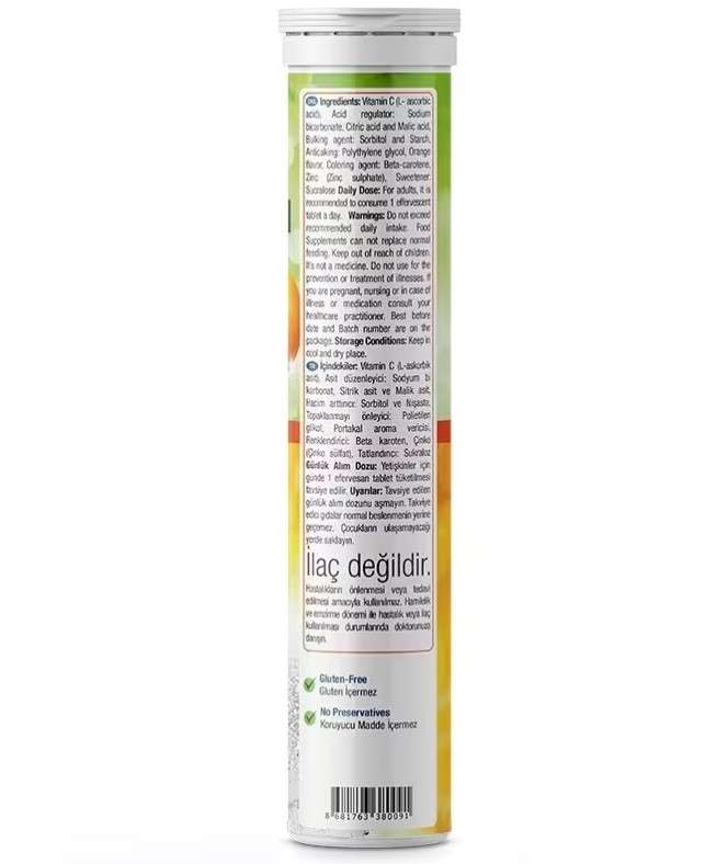 Vitamin C (L-Askorbik asit), ait düzenleyici: sodyum bi karbonati sitrik asit ve malik asit, hacim arttırıcı, sorbitol ve nişasta, topaklanmayı önleyici: polietilen glikol, portakal aroma vericisi, renklendirici: beta karoten, çinko (çinko sülfat), tatlandırıcı: sukraloz