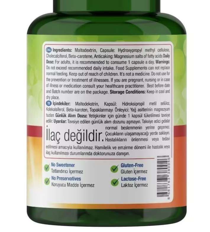 Maltodekstrin, kapsül: hidroksipropil metil selüloz, kolekalsiferol, beta-karotene, topaklanmayı önleyici: yağ asitlerinin magnezyum tuzları