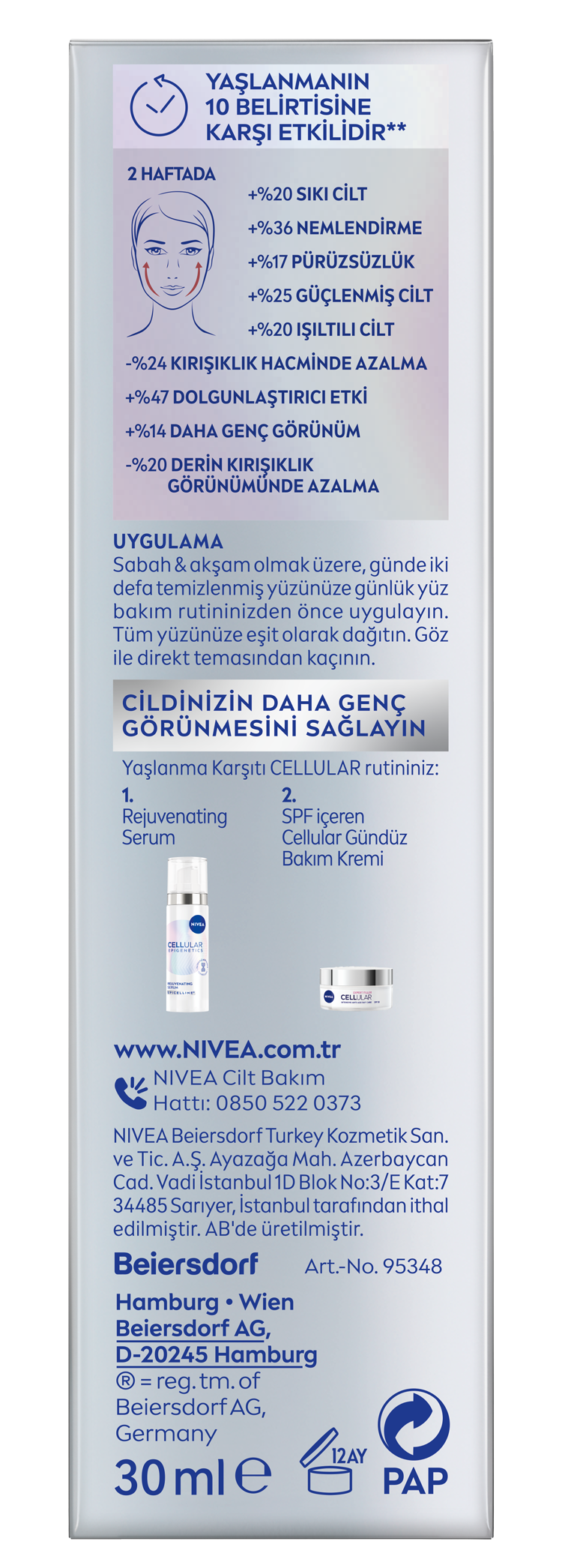 NIVEA Cellular Epigenetics Rejuvenating Serum’u sabah ve akşam olmak üzere, günde 2 defa temizlenmiş yüzünüze günlük yüz bakım rutininizden önce uygulayın. Tüm yüzünüze eşit olarak dağıtın. İkinci adımda NIVEA Cellular Expert Filler Göz Bakım Krem’ini parmak uçlarınızla masaj yaparak göz ve dudak çevrenize uygulayın. 3. Adımda NIVEA Cellular Filler Gündüz Krem’ini temizlenmiş yüz ve boyun bölgesine yuvarlak hareketlerle boyundan başlayarak masaj yapın. Gece ise NIVEA Cellular Filler Gece Yüz Bakım Krem’ini uygulayın.