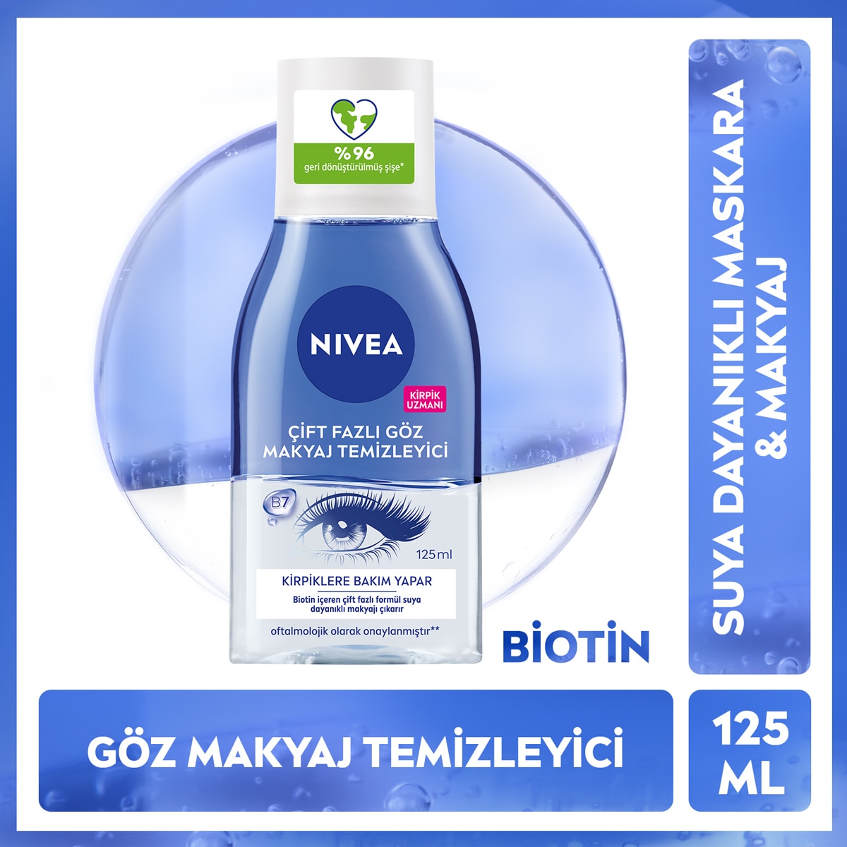 Nivea Çift Fazlı Suya Dayanıklı Göz Makyaj Temizleyici 125 ml  125 ml: Makyaj yapmayı sevenler için geliştirildi. Eksra suya dayanıklı maskara ve makyajı bile etkili şekilde çıkarır. Biotin ile zenginleştirilmiş formülüyle kirpiklerinize bakım yapar. Çift etkili formülü sayesinde hassas kirpikleri bile korur ve kirpiklerinize bakımı yapar. Kontak lens kullanıcıları için kullanıma uygundur.