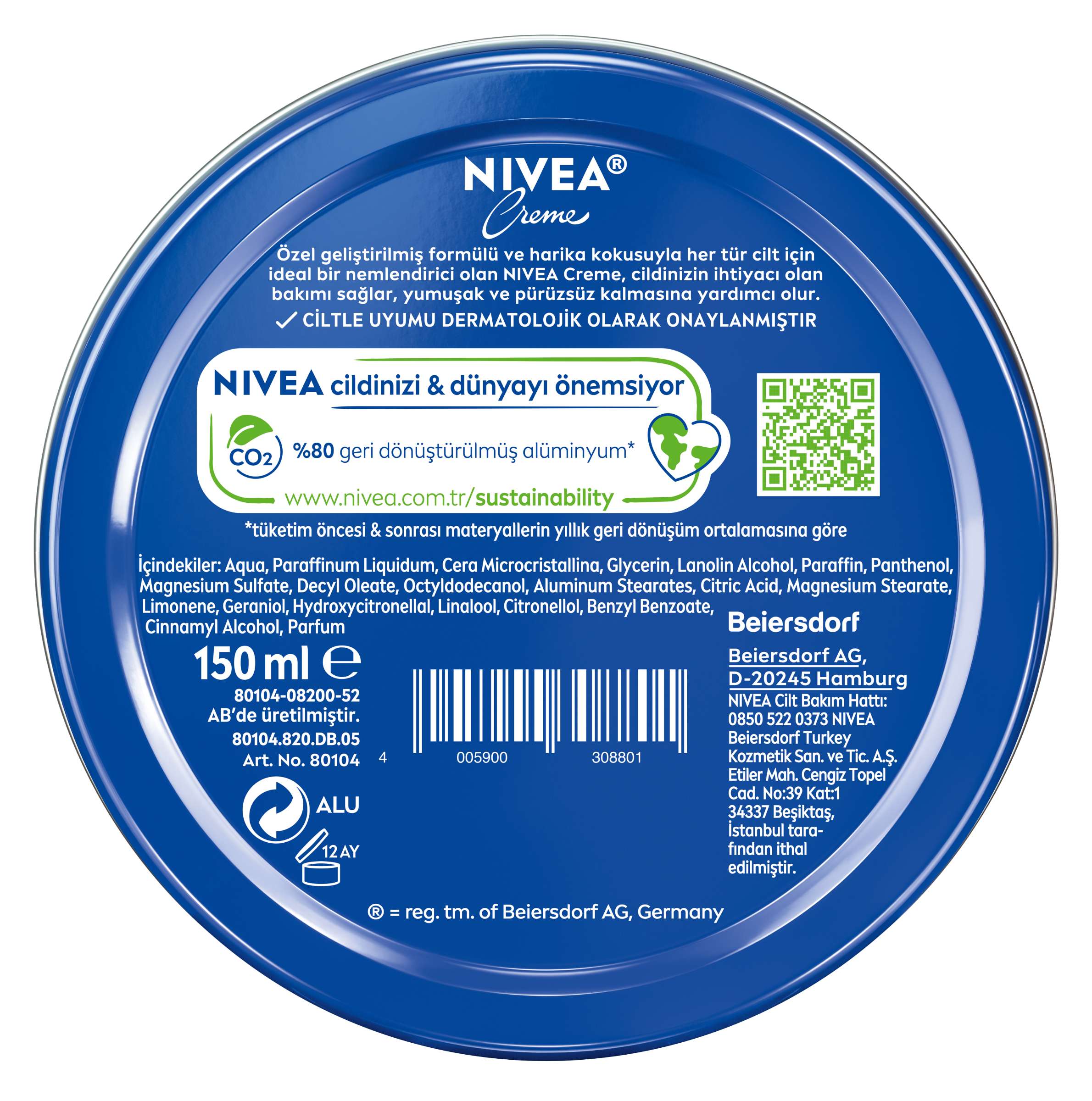 NIVEA Creme 150ml, içeriğindeki özel nemlendirici Eucerit sayesinde cildinizin yumuşak ve pürüzsüz kalmasına yardımcı olur. EUCERIT içeren benzersiz formülüyle özellikle kuruyan ve çatlayan ciltler için ideal olan NIVEA Creme cildi besler ve cildin ihtiyacı olan tüm bakım ve korumayı sağlar. İkonik NIVEA kokusuyla duyularınızı uyandırır. Uzun süreli yoğun nemlendirme sağlar. Yağlı ve yapışkan bir his bırakmaz.