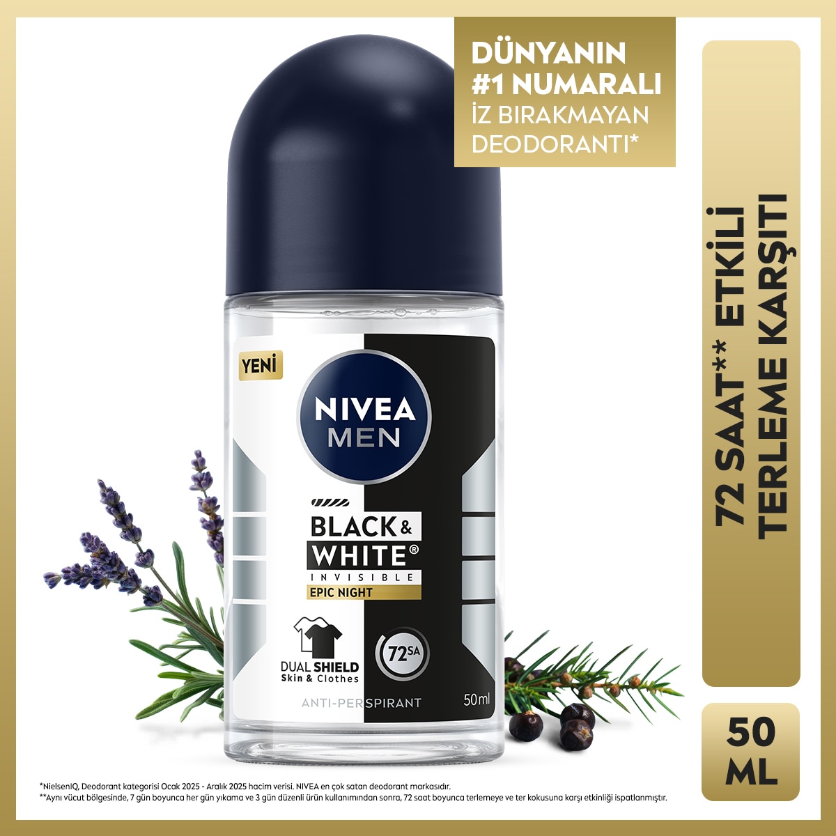 Nivea Men Erkek Roll-On Deodorant Black&White Invisible Epic Night 50 ml, patentli leke karşıtı formüle sahiptir. 72 Saat etkili terleme karşıtı anti-perspirant koruma sağlar. Koyu renkli giysilerde beyaz iz, açık renkli giysilerde sarı leke karşıtı etki sağlar. DUAL SHIELD teknolojisi ile cildi ve kıyafetleri korur. Koku, ter, kalıntıya karşı koruma sağlar. Leke, kalıntı ve kumaş hasarına karşı koruma sağlar. Etil alkol içermez.