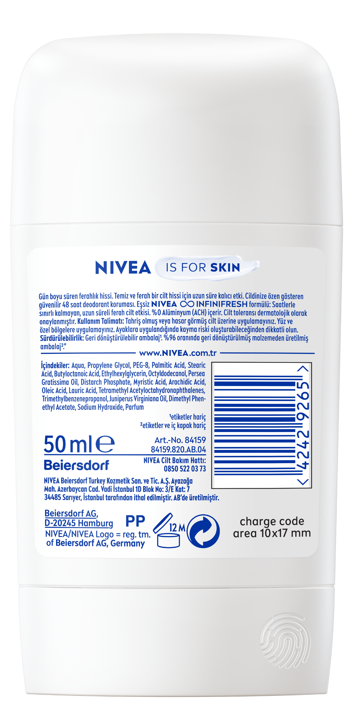 NIVEA Beiersdorf Turkey Kozmetik San. ve Tic. A.Ş, Ayazağa Mah. Azerbaycan Cad. Vadi İstanbul 1D Blok No:3/E Kat:7 34485 Sarıyer, İstanbul tarafından ithal edilmiştir. AB'de üretilmiştir. www.NIVEA.com.trNIVEA Cilt Bakım Hattı: 0850 522 0373