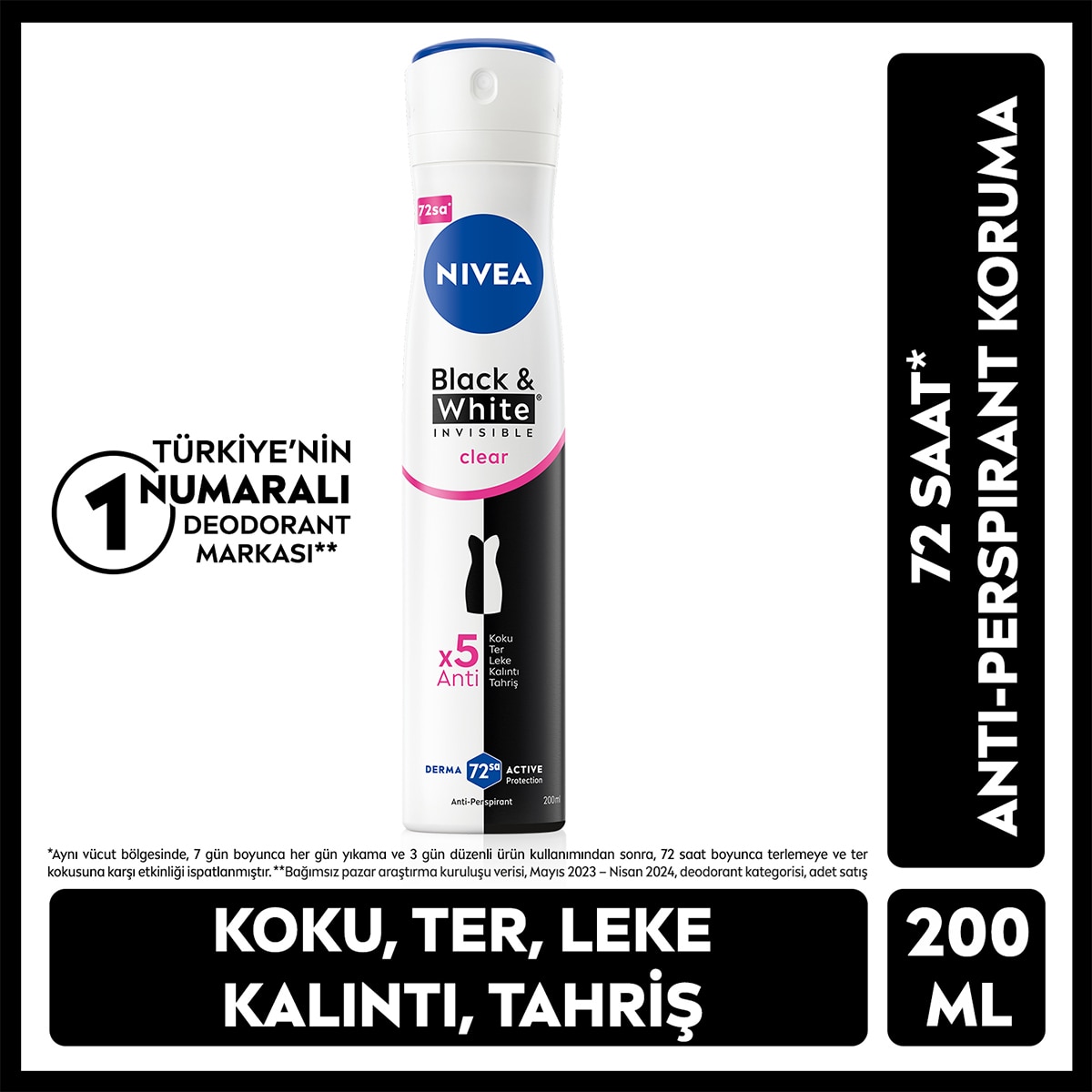 Dünya’nın 1 Numaralı İz Bırakmayan Deodorant Markası* Nivea’dan! Nivea Kadın Sprey Deodorant Black&White Invisible Clear 48 Saat Anti-perspirant Koruma 200 ml; Koyu renkli giysilerde beyaz iz, açık renkli giysilerde ise sarı leke karşıtıdır. 72 Saate kadar* etkili Anti-perspirant koruma sağlar. 72 Saat Derma Active Protection teknolojisi sayesinde cildinizi korur. X5 Anti Formülü ile koku, ter, leke, kalıntı, tahriş karşıtıdır.