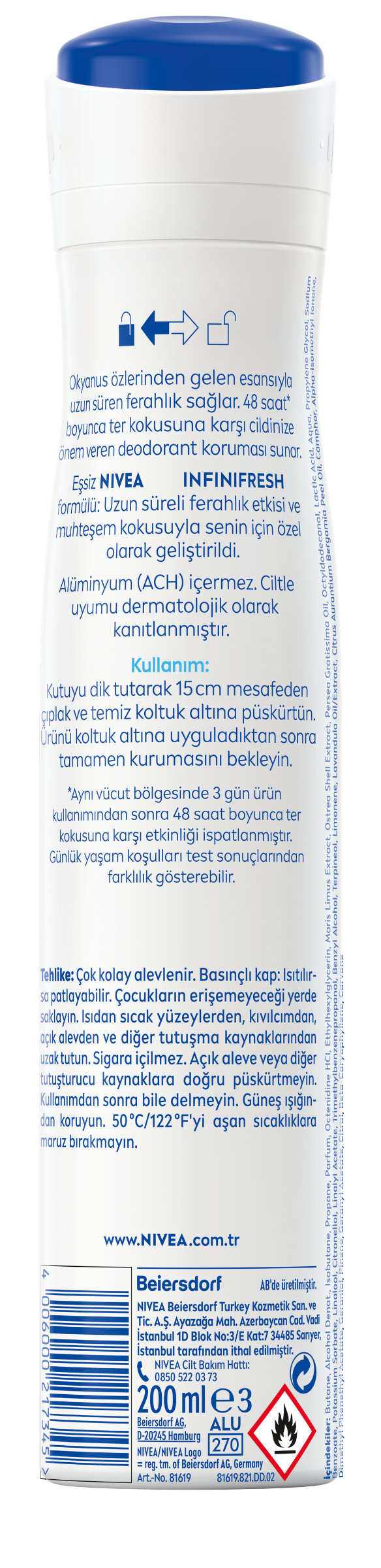 Nivea Kadın Sprey Deodorant Fresh Natural 48 Saat Deodorant Koruma 200 ml: Okyanus özleri içeren formülü ile gün boyu süren ferahlık hissi verir. Ter ve ter kokusuna karşı cildinize önem veren 48 saate kadar etkili deodorant koruması sağlar. Gün boyu güvenilir koruma ve doğal tazelik sağlar