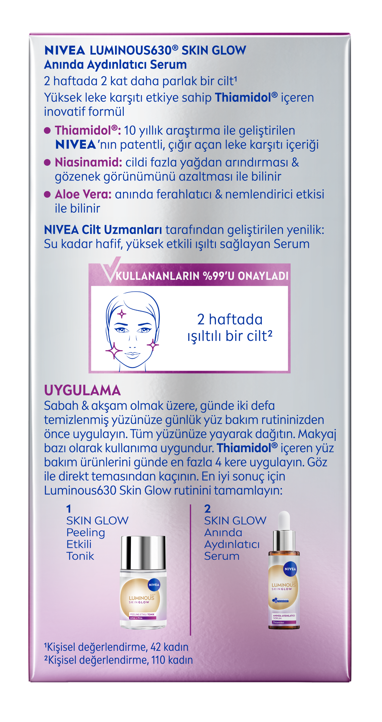 *Kişisel skorlama, parlaklığın üç farklı boyutu üzerinde yapılan değerlendirme (gözenek görünümü, nemlendirme, eşit cilt tonu), 44 kadın, ürün kullanımının öncesine oranla**NIVEA Luminous630 Skin Glow Anında Aydınlatıcı Serum ve Peeling Etkili Tonik ile birlikte kullanıldığında 4 aydınlatıcı etki sunar: Eşit cilt tonu, gözenek görünümü azaltma, nazik peeling etkisi, ferahlatıcı nemlendirme.
