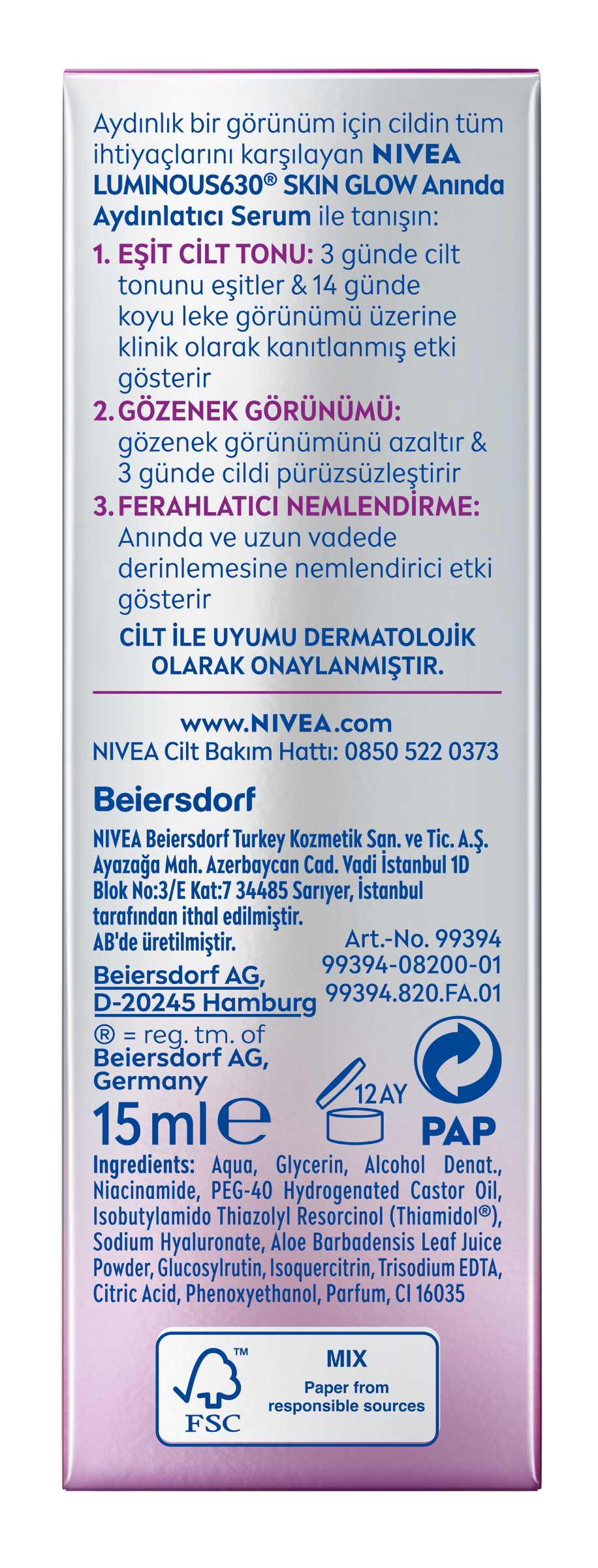 NIVEA Beiersdorf Turkey Kozmetik San. ve Tic. A.Ş, Ayazağa Mah. Azerbaycan Cad. Vadi İstanbul 1D Blok No:3/E Kat:7 34485 Sarıyer, İstanbul tarafından ithal edilmiştir. AB'de üretilmiştir. www.NIVEA.com.trNIVEA Cilt Bakım Hattı: 0850 522 0373