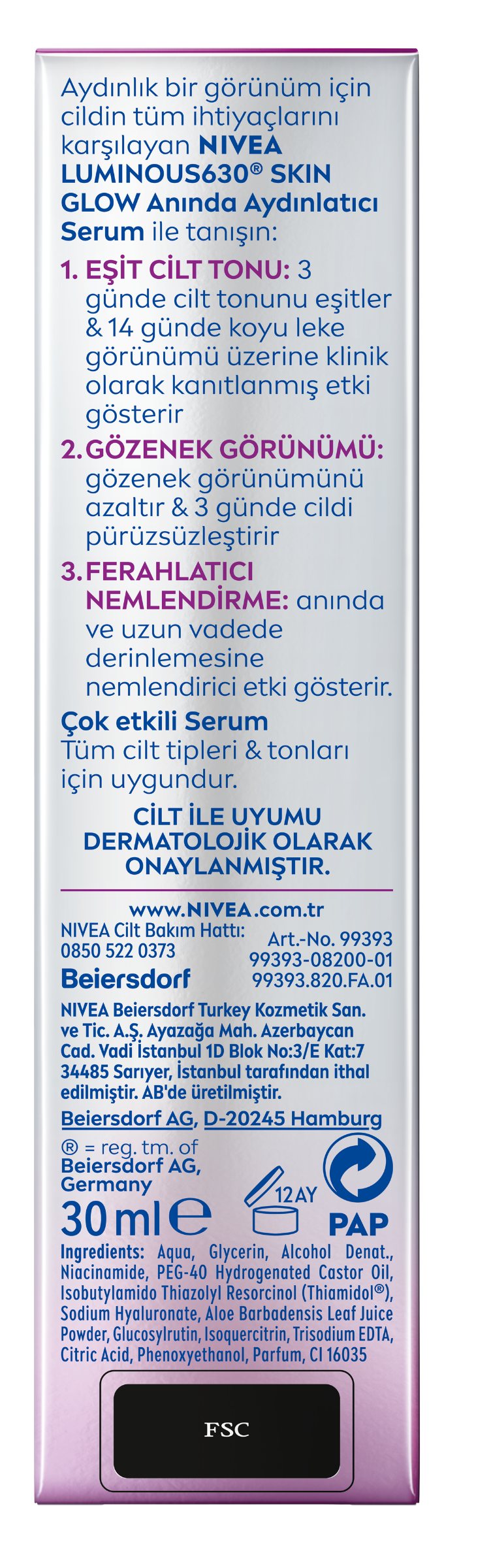 •Aydınlık bir görünüm için cildin tüm ihtiyaçlarını karşılayan NIVEA Luminous630 Sklin Glow Anında Aydınlatıcı Serum 30ml ile tanışın!