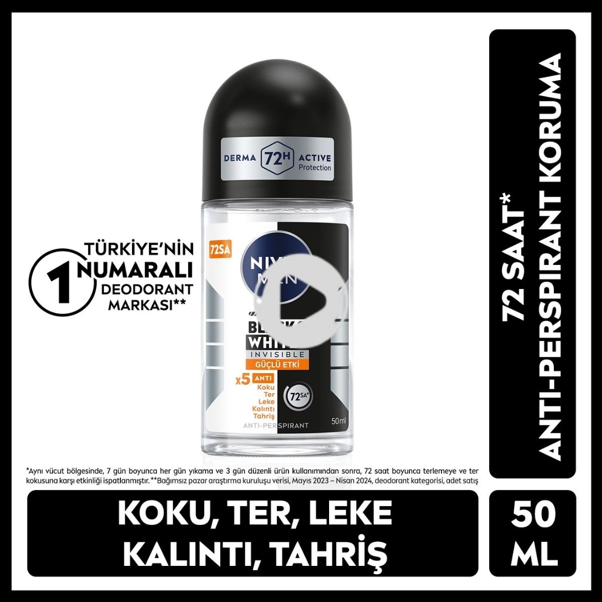 Dünya’nın 1 Numaralı İz Bırakmayan Deodorant Markası* NIVEA’dan! NIVEA MEN Erkek Black&White Deodorant; Koyu renkli giysilerde beyaz iz, açık renkli giysilerde ise sarı leke karşıtıdır. 72 Saate kadar* etkili Anti-perspirant koruma sağlar. 72 Saat Derma Active Protection teknolojisi sayesinde cildinizi korur. X5 Anti Formülü ile koku, ter, leke, kalıntı, tahriş karşıtıdır.
