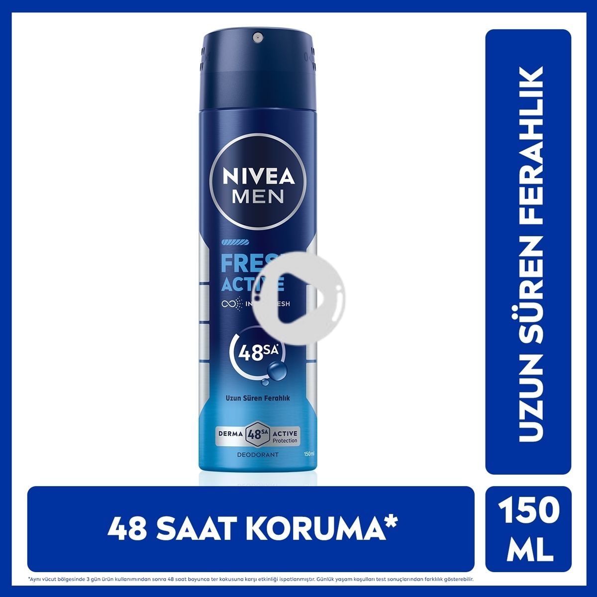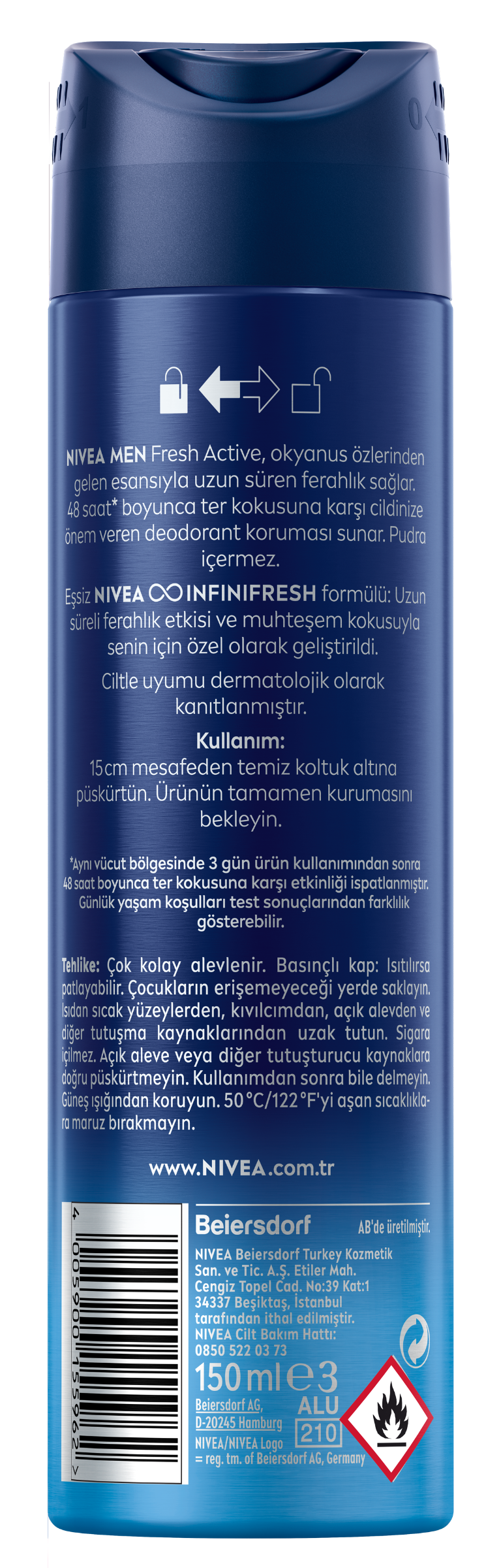 NIVEA MEN Erkek Sprey Deodorant Fresh Active 150ml, okyanus özlerinden gelen esansıyla uzun süreli ferahlık ve mutheşem bir koku sunar. 48 saat* boyunca ter kokusuna karşı cildinize önem veren deodorant koruması sağlar. Derma Active Protection teknolojisi ile cildi 48 saat korur. Eşsiz NIVEA INFINIFRESH formülü: Uzun süreli ferahlık etkisi ve muhteşem kokusuyla senin için özel olarak geliştirildi. Alüminyum (ACH) içermez. Pudrasızdır.