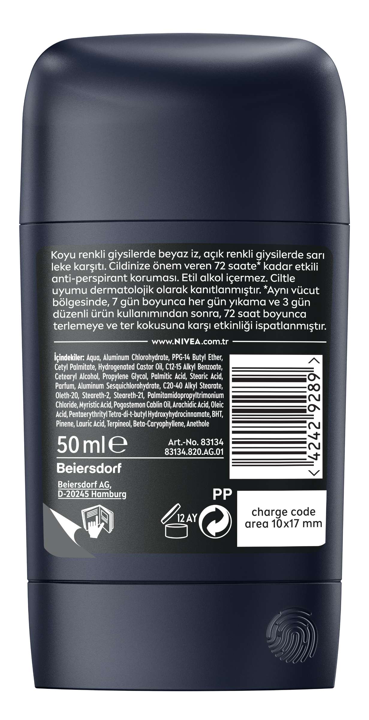 NIVEA MEN Erkek Stick Deodorant Black&White Invisible Original 50ml: Koyu renkli giysilerde beyaz iz, açık renkli giysilerde ise sarı leke karşıtıdır. 72 Saate kadar* etkili Anti-perspirant koruma sağlar. 72 Saat Derma Active Protection teknolojisi sayesinde cildinizi korur. Cesur ve erkeksi kokuya sahiptir. X5 Anti Formülü ile koku, ter, leke, kalıntı, tahriş karşıtıdır. Etil alkol içermez. Ürün sabun formattadır.