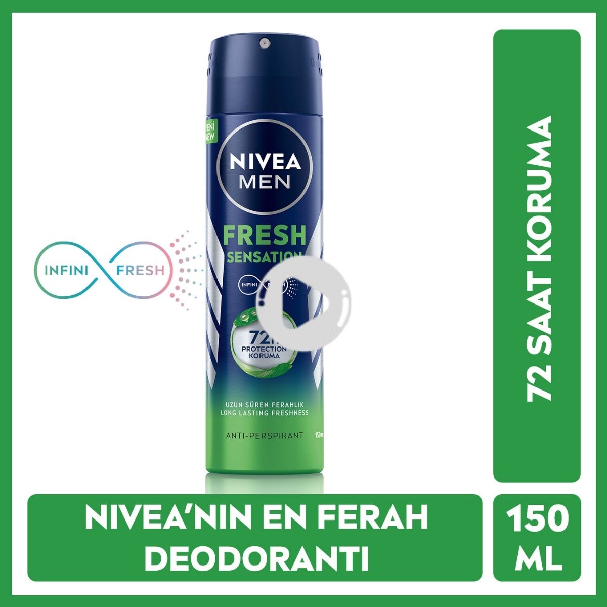 NIVEA Fresh Sensation eşsiz INFINI-FRESH teknolojisi ile 72 saate kadar* koruma sağlar. Taze ve erkeksi çekici kokusu sayesinde gün boyu ferahlık sunar. Terlemeye ve ter kokusuna karşı cildinize önem veren anti-perspirant koruma sağlar.