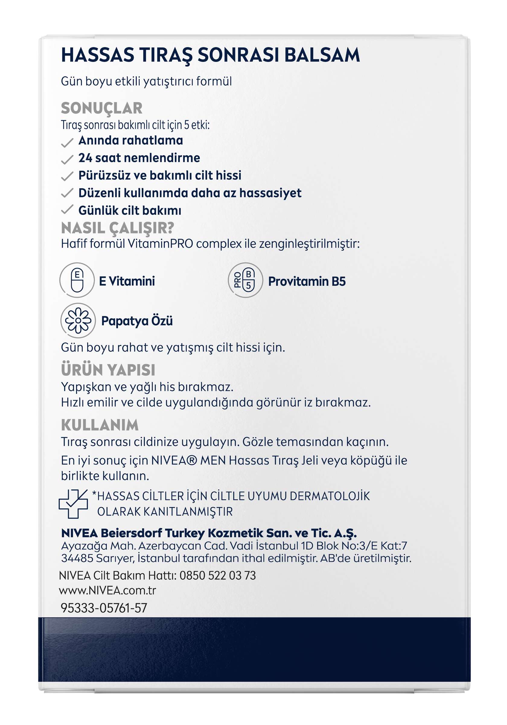 NIVEA MEN Erkek Hassas Tıraş Sonrası Balsam 100ml: Tıraş sonrasında özellikle hassas ciltlerde tahrişi yatıştırırken,cilt kızarıklıklarını azaltır. Kullanım sonrası cildi rahatlatır ve sağlıklı bir görünüm kazandırır. Etil alkol içermez. İçeriğindeki provitamin B5 ve besleyici E vitamini sayesinde tıraştan sonra cildi yumuşak bir şekilde rahatlatır ve cildin görünümünü güzelleştirir. Zengin bakım içeriği ile cildin tıraş nedeniyle tahriş olmasını önler. Cildin kendine özgü doğal bakım özelliklerini destekler. Cilt tahrişini hızlıca yatıştırır %0 Alkol içeren ekstra hassas formülü sayesinde ciltteki yanma hissinin azalmasına yardımcı olur. Hızlı emilir ve yapışkan his bırakmaz.