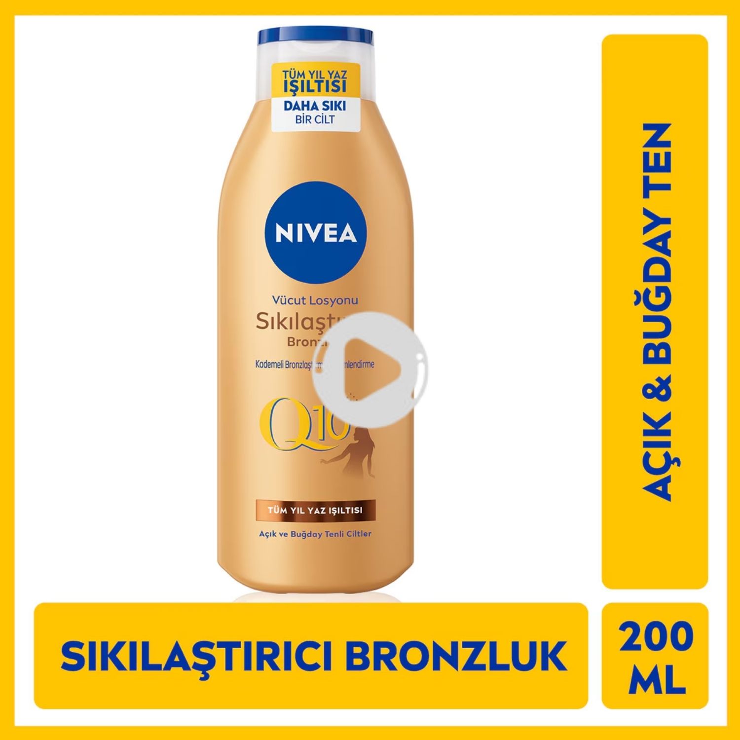 NIVEA Q10 Sıkılaştırıcı ve Bronzluk Vücut Losyonu 200ml ile sıkı, ışıltılı ve doğal bronz cilt görünümünü keşfedin! Tüm yıl yaz ışıltısı!