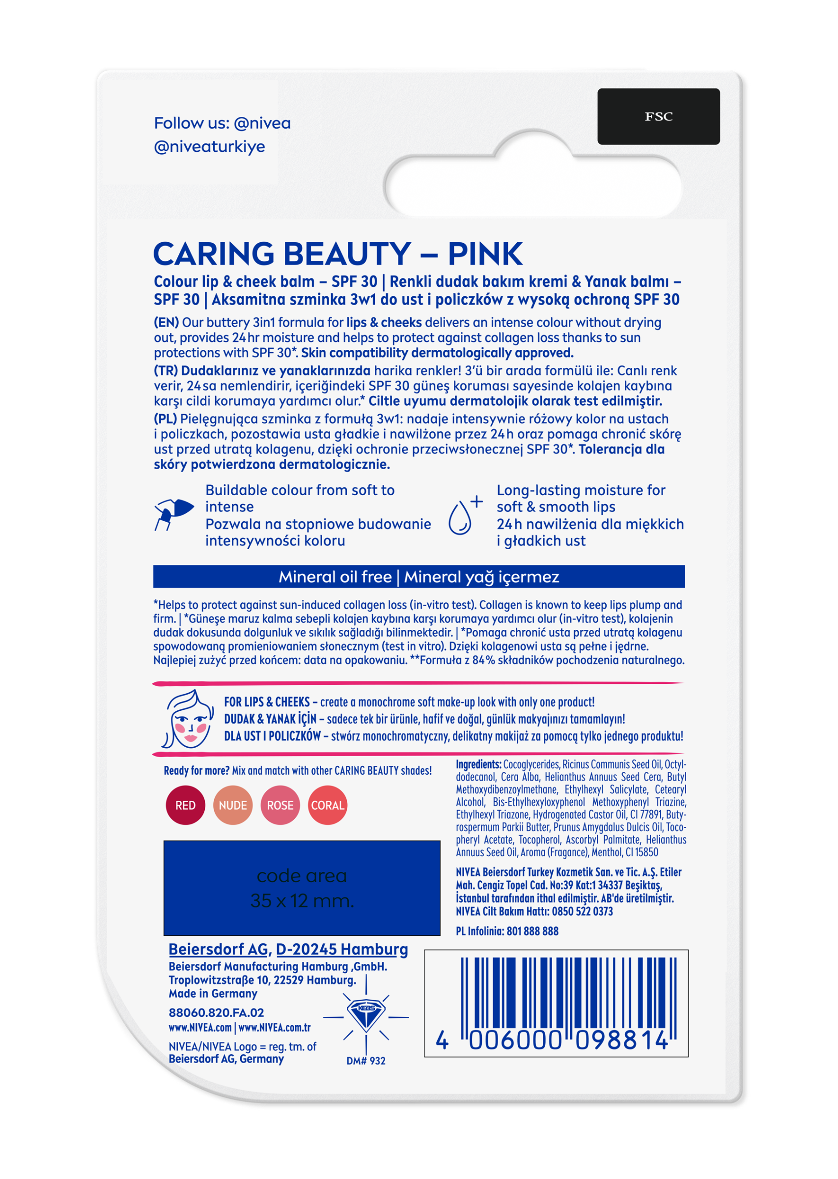 3’ü 1 Arada formülüyle pembe renkli dudak bakım kremi SOF30 UV Koruması ve 24 saat nemlendirme sağlar. Güneş kaynaklı kolajen kaybına karşı korumaya yardımcı olur. Kolajenin dudak dokusunda dolgunluk ve sıkılık sağladığı bilinmektedir. E Vitamini Shea Yağı Organik Badem Yağı içerir. Dudaklarınızda ve yanaklarınıza harika renklerle eşsiz NIVEA bakımı! Tek dokunuşta hızlı ve kolay şekilde makyajınızı tamamlamanızı sağlar. Mineral yağı içermez. Herkes için bakımlı ve pürüzsüz dudaklar!