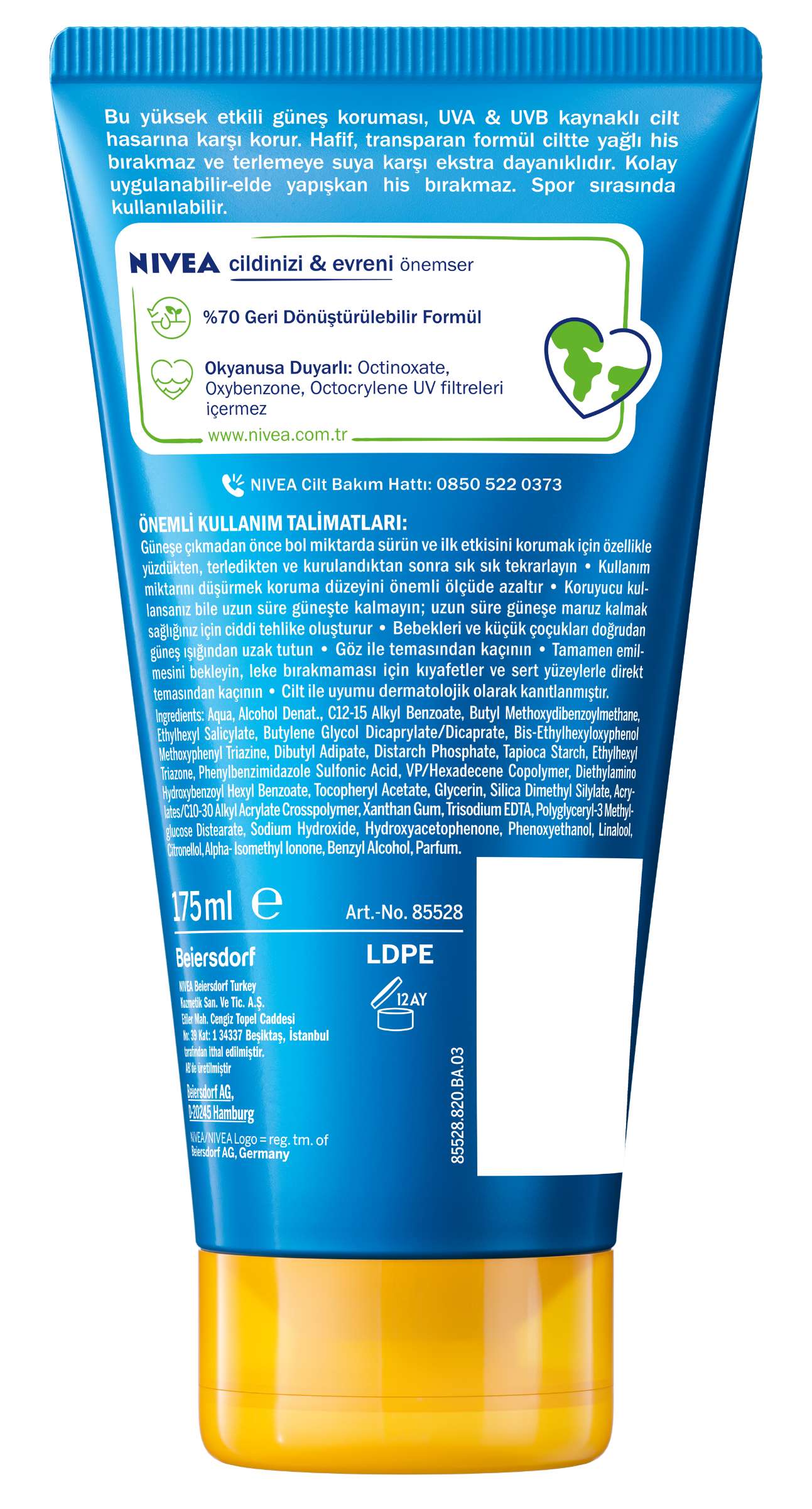 NIVEA Beiersdorf Turkey Kozmetik San. ve Tic. A.Ş, Ayazağa Mah. Azerbaycan Cad. Vadi İstanbul 1D Blok No:3/E Kat:7 34485 Sarıyer, İstanbul tarafından ithal edilmiştir. AB'de üretilmiştir. www.NIVEA.com.trNIVEA Cilt Bakım Hattı: 0850 522 0373
