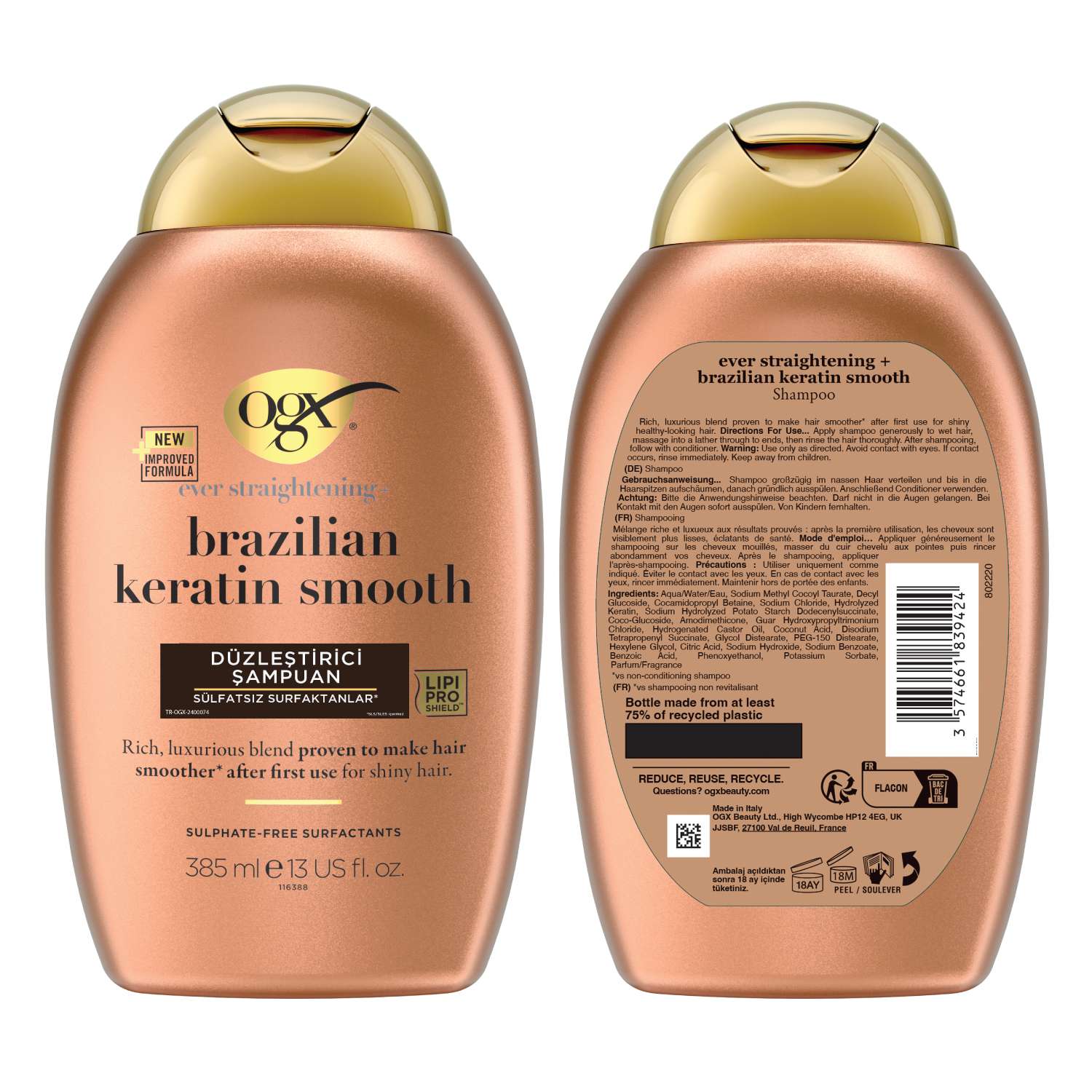 OGX Brazilian Keratin Smooth Şampuan formülündeki hindistan cevizi yağı, keratin proteinleri, avokado yağı ve kakao yağı ile kıvırcık veya dalgalı saçlarınızı güçlendirir ve yumuşatır. Saç tellerinin pürüzsüzleşmesine yardımcı olarak saçlarınızı düzleştirir. Sülfat içermeyen OGX Brazilian Keratin Smooth Şampuan, saçlarınızın ışıldayan bir parlaklığa kavuşmasına yardımcı olur.