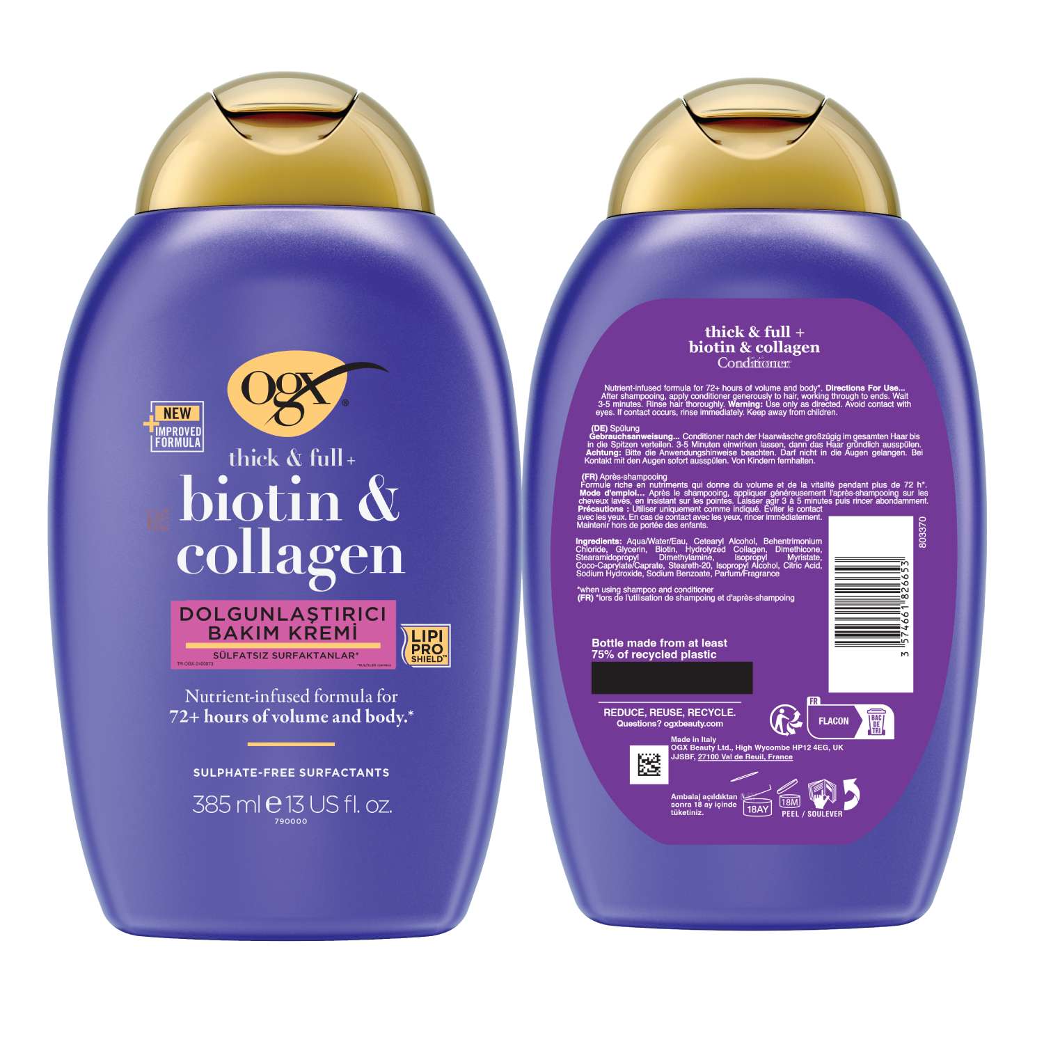 OGX BiotinCollagen Saç Kremi formülündeki B7 vitamininin biotini, kolajen ve hidrolize edilmiş buğday proteini, besin maddelerinin saç tellerinizin arasına girmesine yardımcı olur. Saçlarınızın daha dolgun ve daha sağlıklı görünmesine yardımcı olup. Daha dolgun görünen ve parlak saçlar için bakıma ihtiyaç duyan saçlarınızı mükemmel hacim verici bu formüle daldırın.