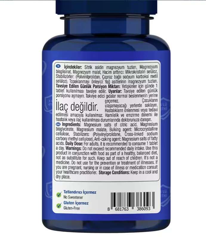 Sitrik asidin magnezyum tuzları, magnezyum bisglisinat, magnezyum malat,hacim arttırıcı: mikrokristalin selüloz, stabilizörler:(polivinilprolidon, çapraz bağlı sodyum karboksi metil selüloz), topaklanmayı önleyici: yağ asitlerinin magnezyum tuzları