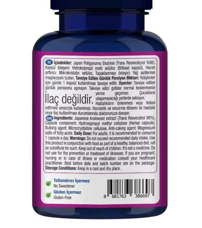 - Her serviste 255 mg Japon poligonumu ekstresi, 250 mg trans resveratrol
