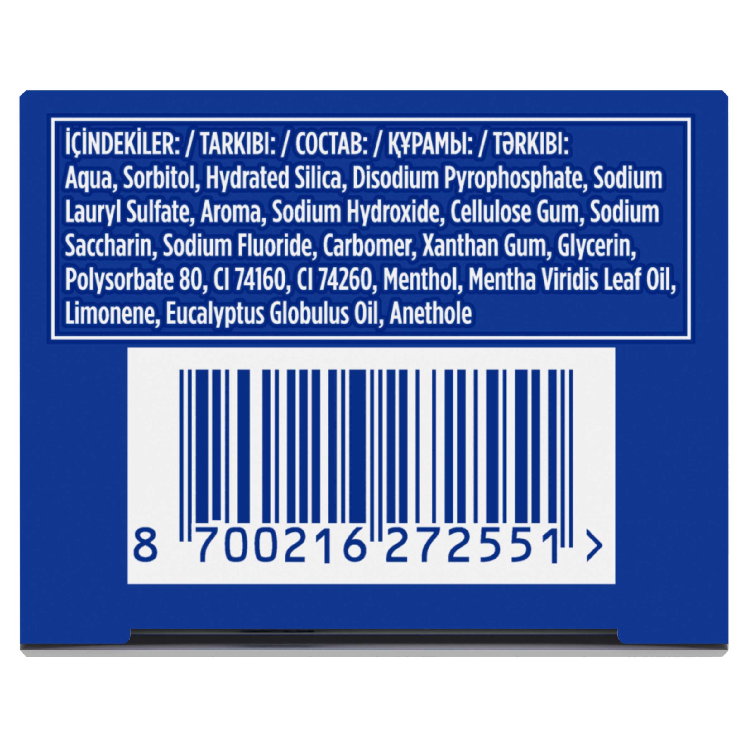Aqua, Sorbitol, Hydrated Silica, Disodium Pyrophosphate, Sodium Lauryl Sulfate, Aroma, Sodium Hydroxide, Cellulose Gum, Sodium Saccharin, Sodium Fluoride, Carbomer, Xanthan Gum, Limonene, Glycerin, Polysorbate 80, CI 74160, CI 74260