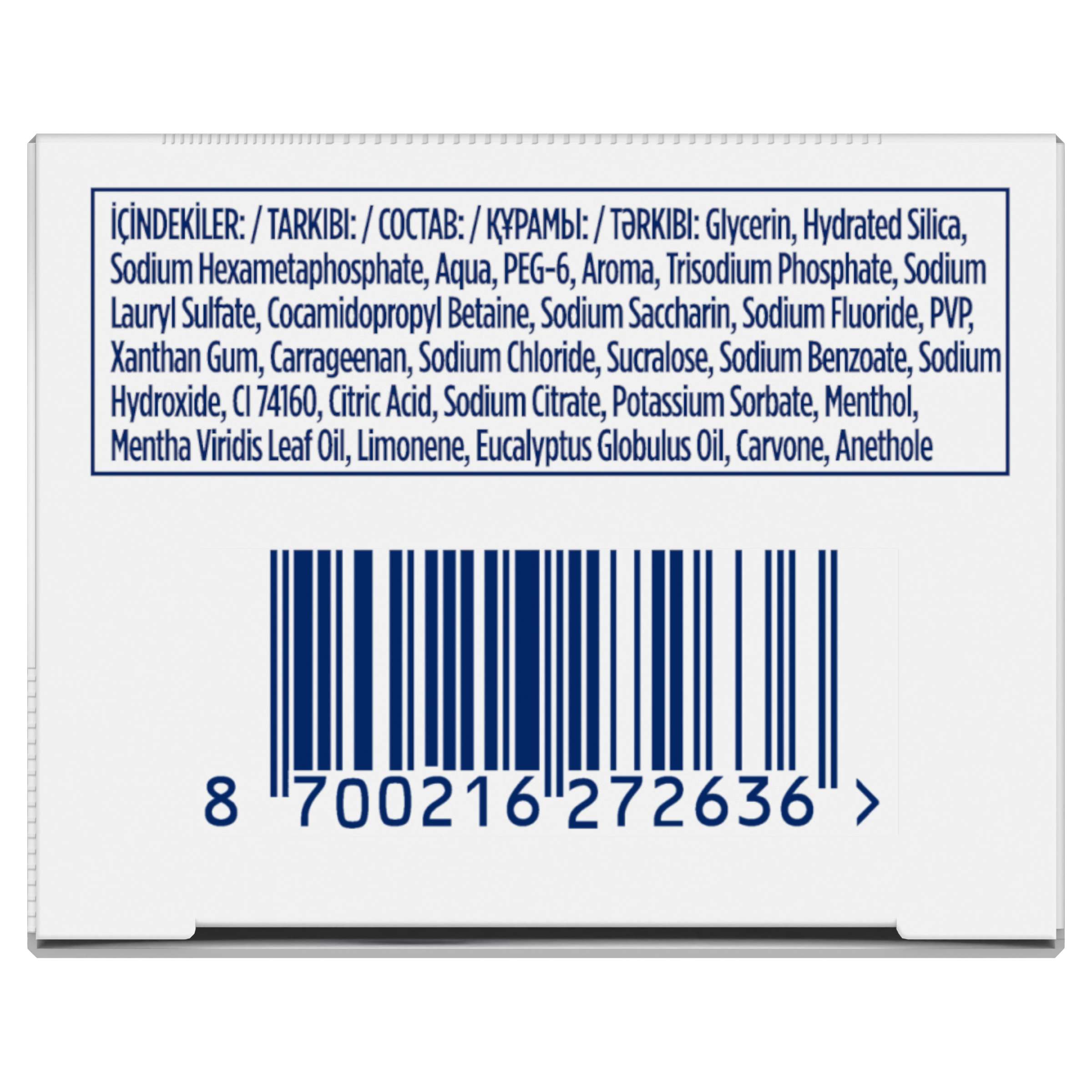 Glycerin, Hydrated Silica, Sodium Hexametaphosphate, Aqua, PEG-6, Aroma, Trisodium Phosphate, Sodium Lauryl Sulfate, Cocamidopropyl Betaine, Sodium Saccharin, Sodium Fluoride, Pvp, Xanthan Gum, Carrageenan, Sodium Chloride, Sucralose, Limonene, Sodium Benzoate, Sodium Hydroxide, CI 74160, Citric Acid, Sodium Citrate, Potassium Sorbate