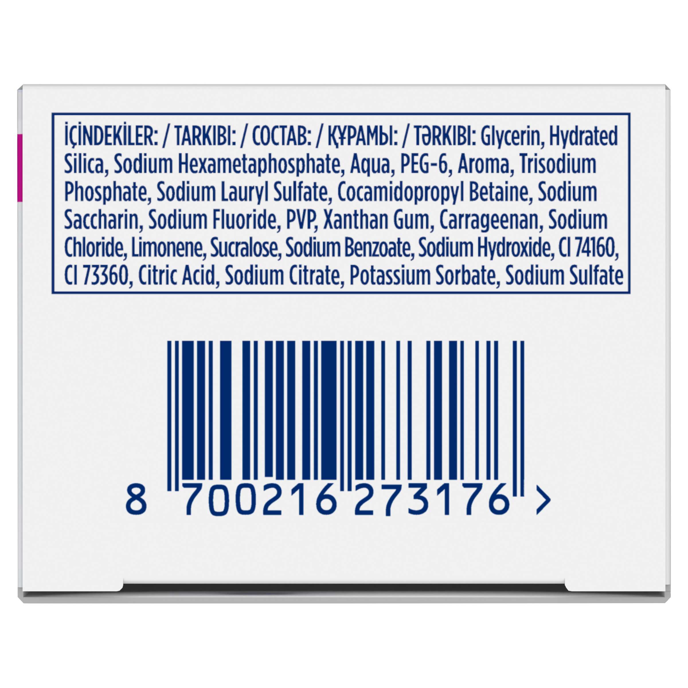 Glycerin, Hydrated Silica, Sodium Hexametaphosphate, Aqua, PEG-6, Aroma, Trisodium Phosphate, Sodium Lauryl Sulfate, Cocamidopropyl Betaine, Sodium Saccharin, Sodium Fluoride, Pvp, Xanthan Gum, Carrageenan, Sodium Chloride, Limonene, Sucralose, Sodium Benzoate, Sodium Hydroxide, CI 74160, CI 73360, Citric Acid, Sodium Citrate, Potassium Sorbate, Sodium Sulfate