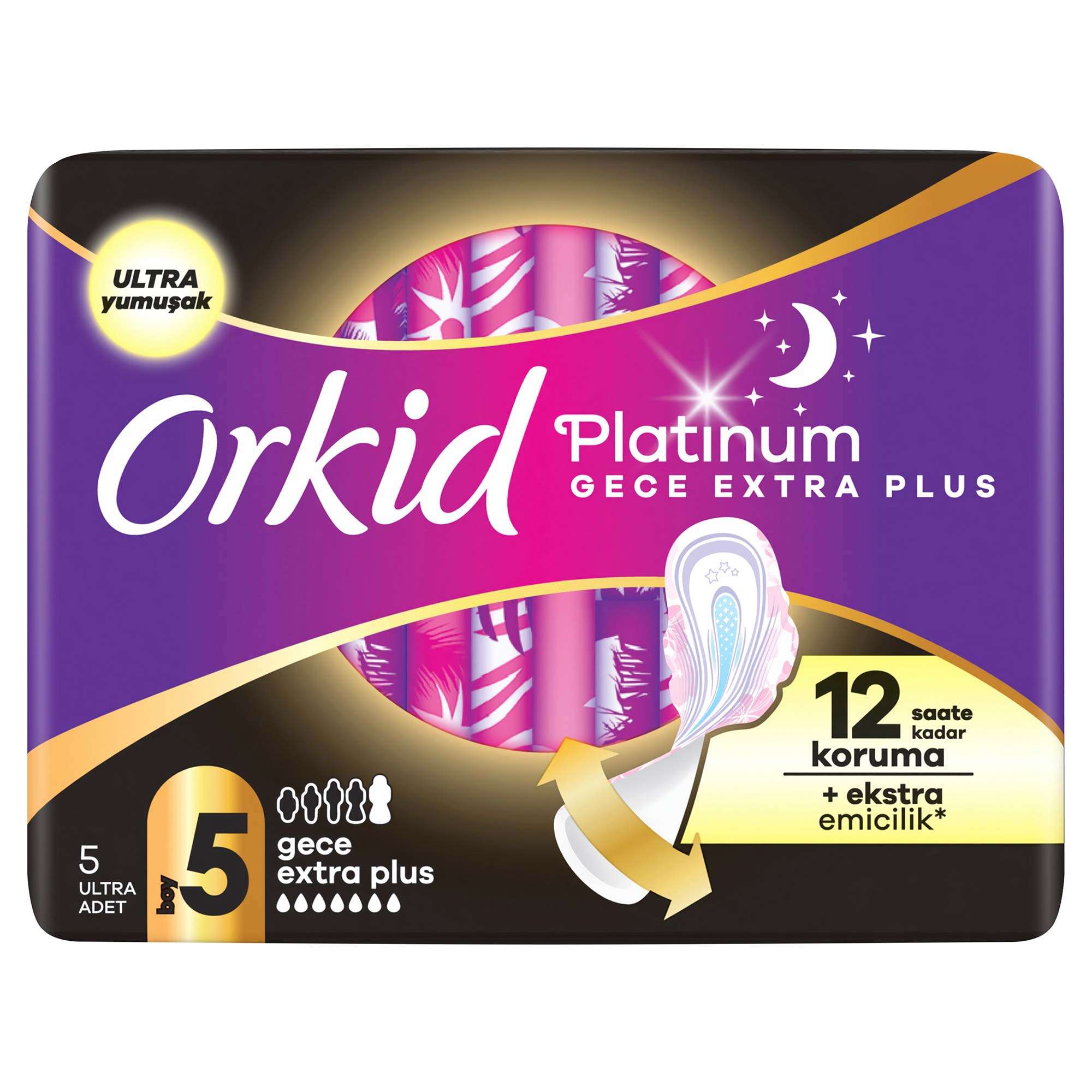 Orkid Platinum Hijyenik Pedler sıfır sızıntı, sıfır kayma ve sıfır rahatsızlığa kadar daha iyi uyum sağlamak için tasarlamıştır. Orkid Platinum Hijyenik Pedlerle endişe etmeden uyuyabilirsiniz. Orkid Platinum Gece Extra (Boy 5) %60* daha büyük arka yüzeye sahiptir, böylece en çok ihtiyaç duyduğunuz alanda daha fazla koruma sunar. *Orkid Platinum Normal’e (Boy 1) kıyasla