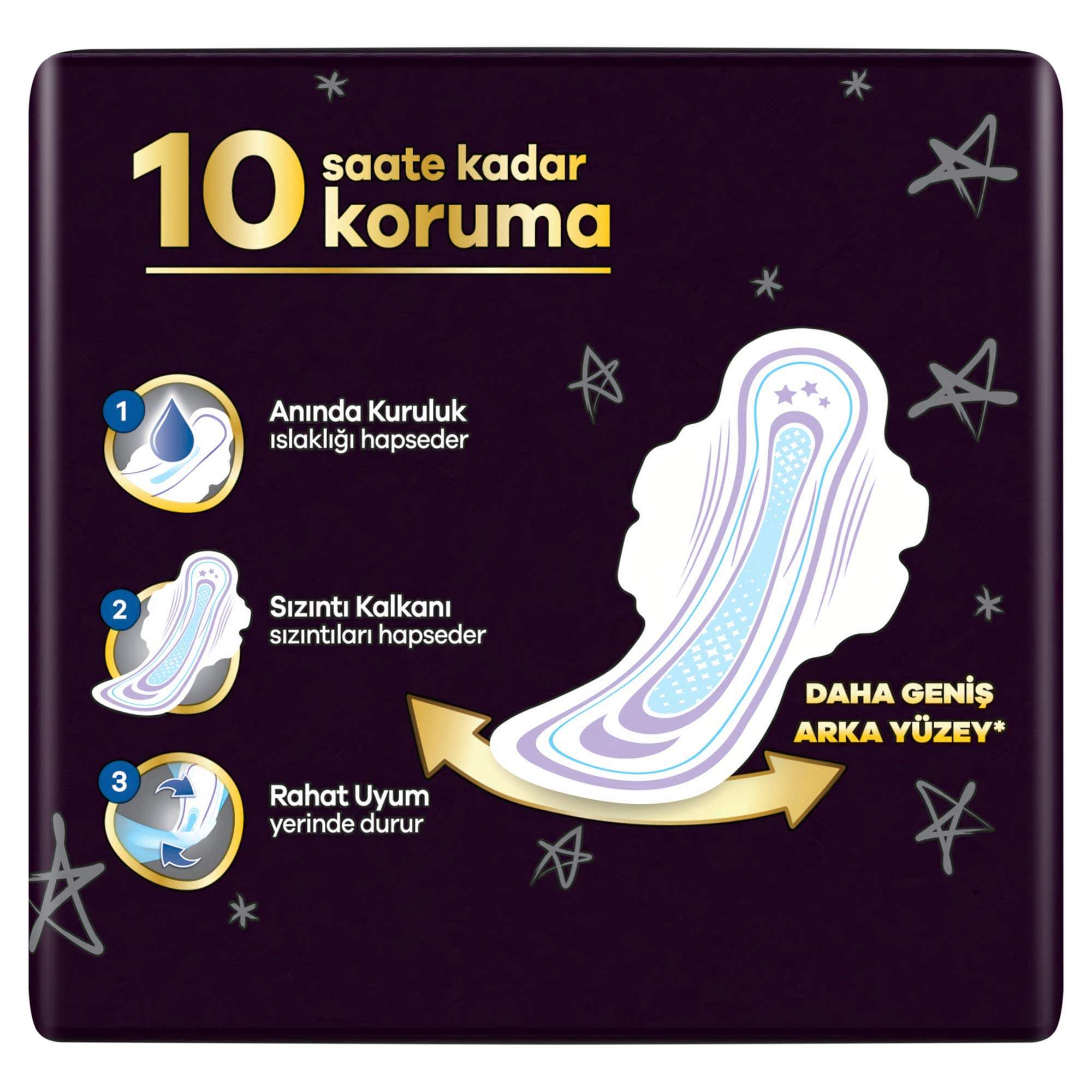10 saate kadar koruma ile iyi bir gece uykusundan daha azına razı olmayın: Kanatlı Orkid Ultra Gece Extra (boy 4) hijyenik pedler, gece boyu sızıntı olup olmadığını görmek veya pedinizi değiştirmek için uyanmanıza gerek bırakmayan, 3 adet koruma özelliği ile tasarlanmıştır. (Orkid Ultra Normal Boy 1’e kıyasla) %60 daha büyük arka kısım ile birlikte Orkid’in LeakGuard teknolojisi adet dönemi gecelerinde sıvıyı hapseder ve sızıntıları önlemeye yardımcı olur. InstantDry sistemi, sıvıyı saniyeler içinde emer ve ıslaklığı cildinizden uzak tutar. Ayrıca, uyku pozisyonunuz ne olursa olsun, pedinizin yerinde kalması için tasarlanan ComfortFit Sistemi’ne sahiptir. Rahat uyuyun: Orkid Ultra 3 kat koruma ile içinizi rahat tutar.