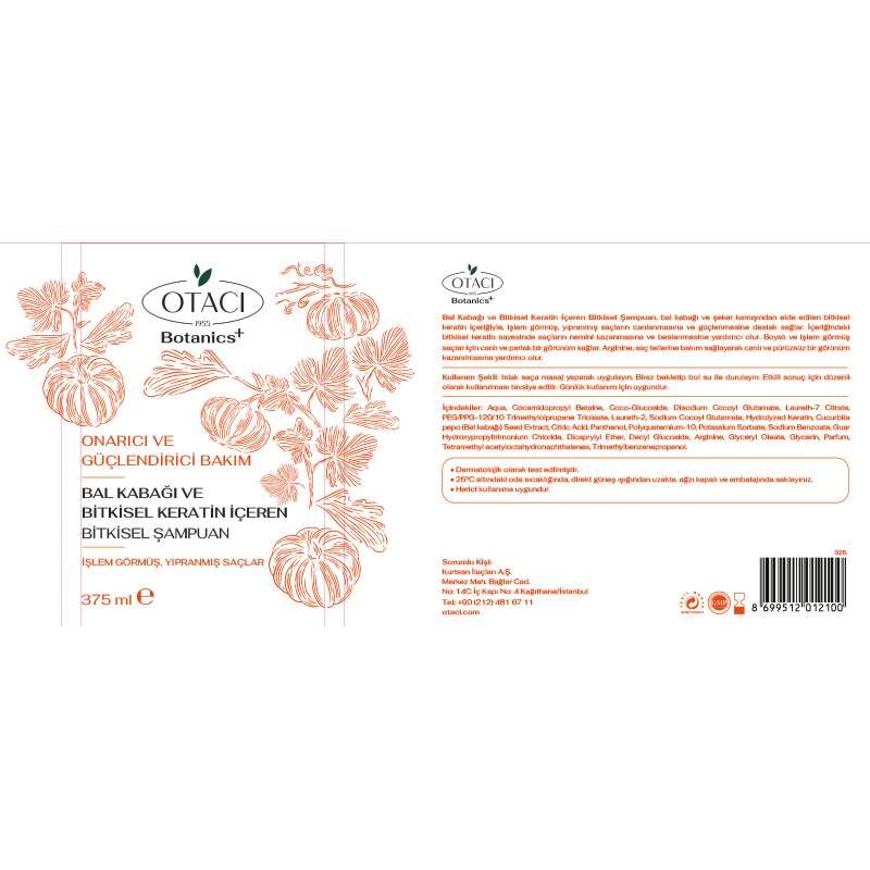 Aqua, Cocamidopropyl Betaine, Coco-Glucoside, Disodium Cocoyl Glutamate, Laureth-7 Citrate, PEG/PPG-120/10 Trimethylolpropane Trioleate, Laureth-2, Sodium Cocoyl Glutamate, Hydrolyzed Keratin, Cucurbita pepo (Bal kabağı) Seed Extract, Citric Acid, Panthenol, Polyquaternium-10, Potassium Sorbate, Sodium Benzoate, Guar Hydroxypropyltrimonium Chloride, Dicaprylyl Ether, Decyl Glucoside, Arginine, Glyceryl Oleate, Glycerin, Parfum, Tetramethyl acetyloctahydronaphthalenes, Trimethylbenzenepropanol.