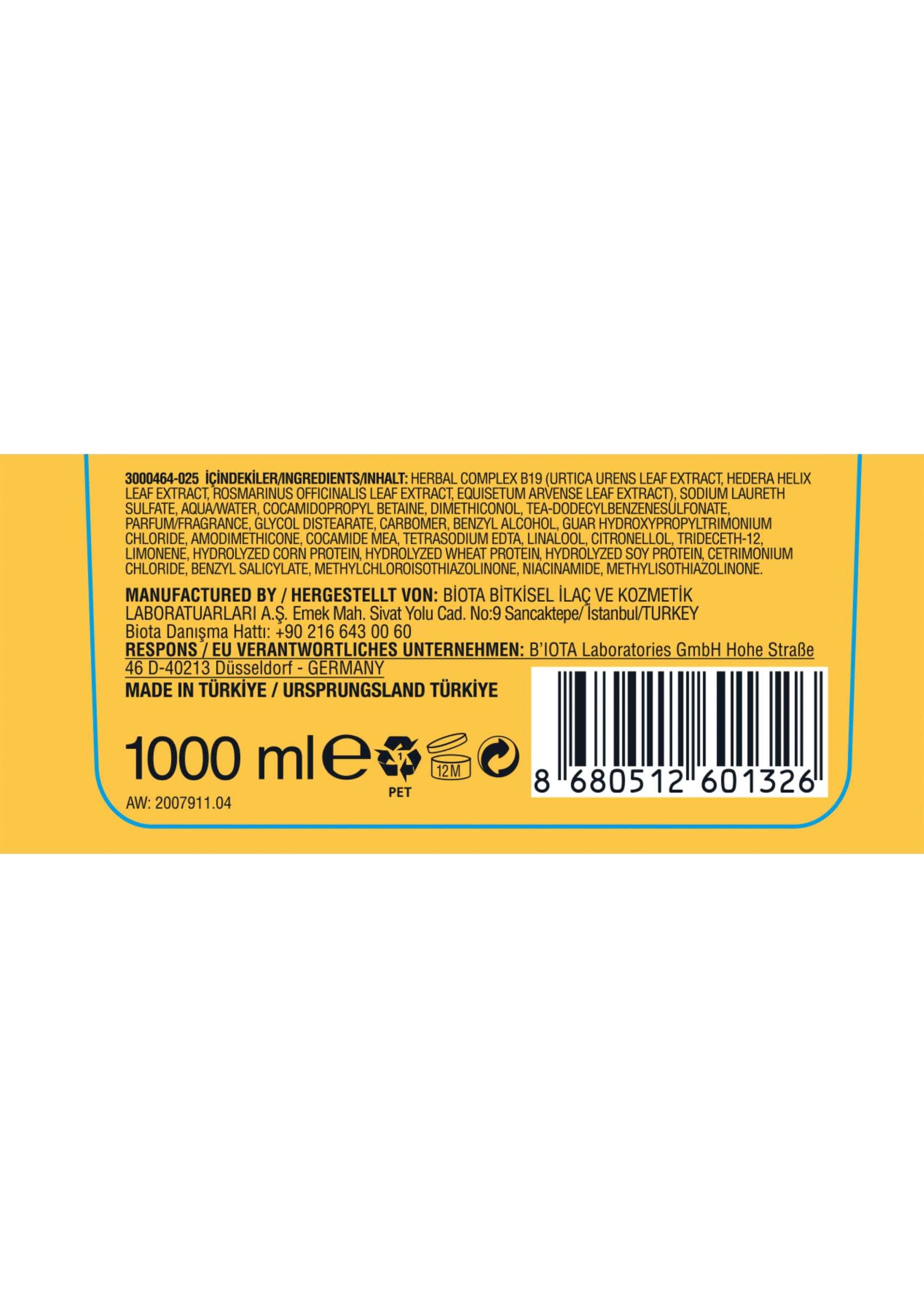 Herbal Complex B19 (Urtica Urens Leaf Extract, Hedera Helix Leaf Extract, Rosmarinus Officinalis Leaf Extract, Equisetum Arvense Leaf Extract), Sodium Laureth Sulfate, Aqua / Water, Cocamidopropyl Betaine, Dimethiconol, TEA-Dodecylbenzenesulfonate, Parfum / Fragrance, Glycol Distearate, Carbomer, Benzyl Alcohol, Guar Hydroxypropyltrimonium Chloride, Amodimethicone, Cocamide MEA, Tetrasodium EDTA, Linalool, Citronellol, Trideceth-12, Limonene, Hydrolyzed Corn Protein, Hydrolyzed Wheat Protein, Hydrolyzed Soy Protein, Cetrimonium Chloride, Benzyl Salicylate, Methylchloroisothiazolinone, Niacinamide, Methylisothiazolinone.