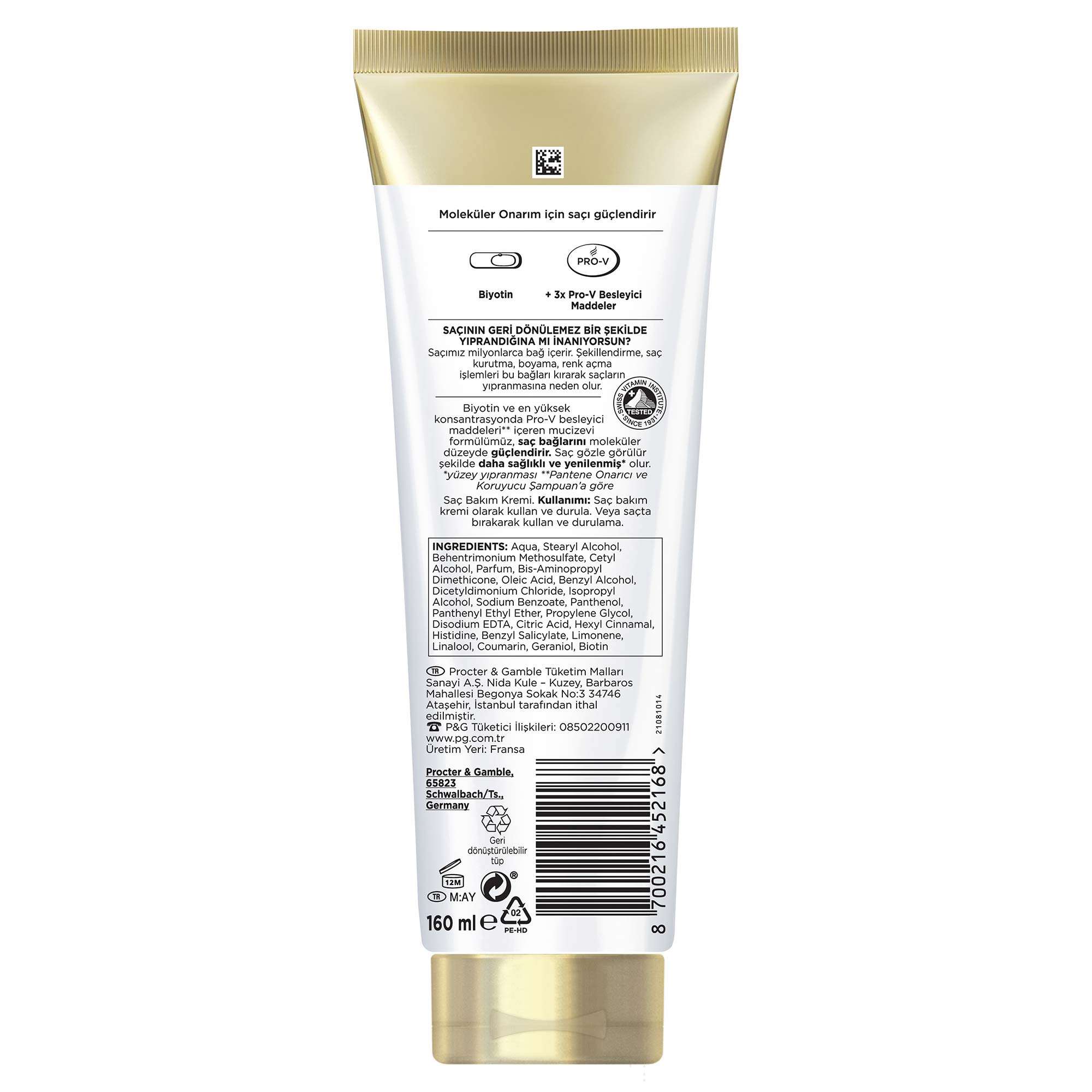 Pantene’in biyotin içeren moleküler saç teli onarıcı saç kremini keşfedin. Saç şekillendirme, kurutma, boyatma ve açma işlemleri saç tellerine büyük zarar vererek yıpranmaya neden olabilir. Saçlarınızın bir mucizeye ihtiyacı varsa Molecular Bond Repair saç kremi saç tellerini moleküler düzeyde güçlendirerek saçı gözle görülür biçimde iyileştirip canlandırır*. Bu mucizevi formül, biyotin ve yoğunlaştırılmış Pro-V Besleyici Maddelerle zenginleştirilmiştir. Molecular Bond Repair serimiz, yıpranmış saçların* görünümünü iyileştirmek üzere tasarlanmıştır. En iyi sonuç için Molecular Bond Repair saç bakım serisindeki diğer ürünlerle (şampuan, saç maskesi ve saç yoğun uygulama kürü) birlikte kullanın. *yüzey hasarına karşı