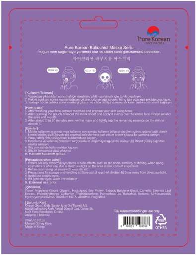 Pure Korean Bakuchiol Maske, Cilt temizliği sonrası cildi hazırlamak için tonik uygulayın. Paketin içinden çıkan maskeyi göz ve ağız çevresi hariç tüm yüze eşit şekilde uygulayın.Yaklaşık 10-20 dakika sonra maskeyi çıkarın ve hafifçe cilde masaj yaparak kalan özün emilmesini sağlayın.