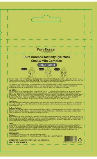Pure Korean Elasticity Göz Maskesi, içeriği snail ve vita complex ile zenginleştirilmiştir.