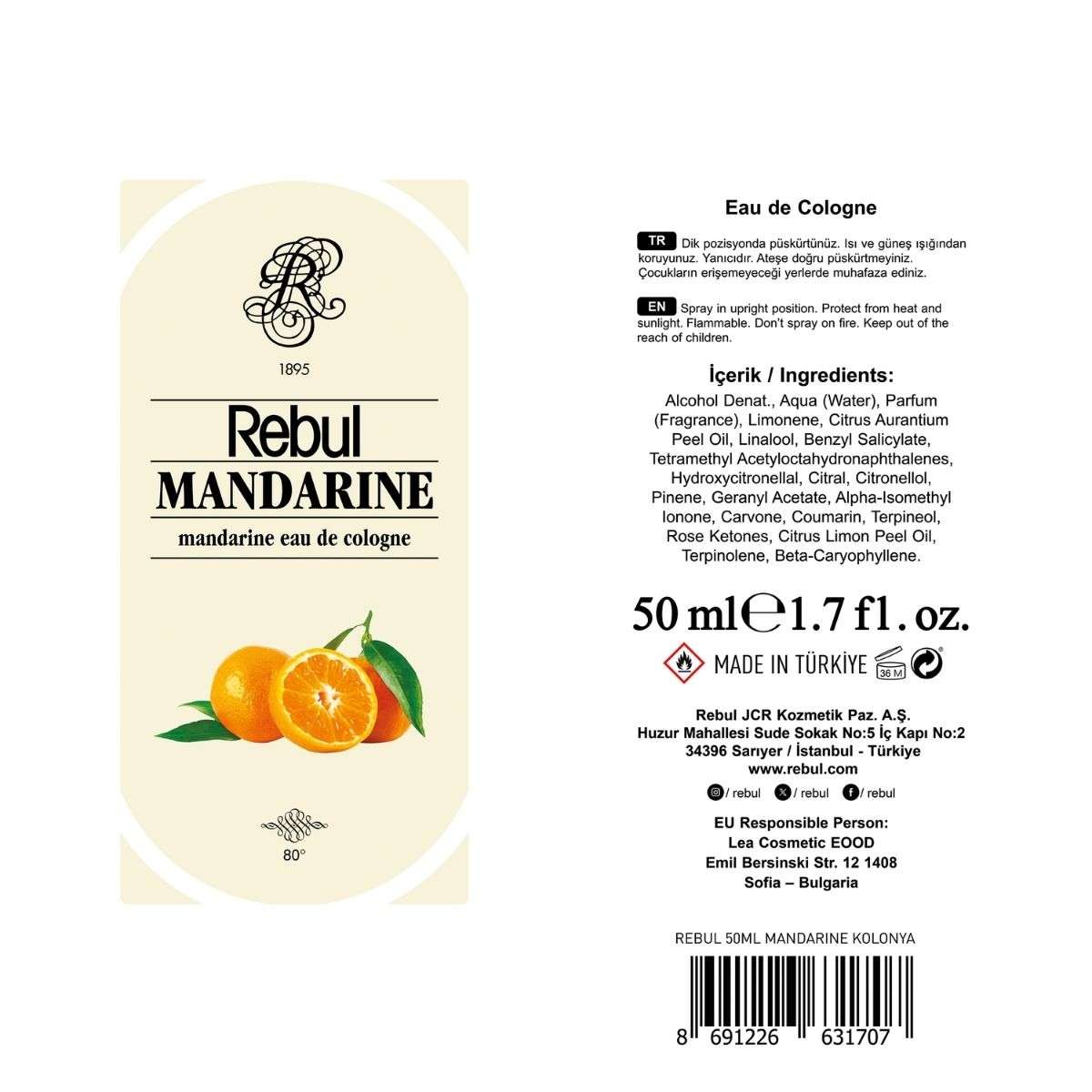 Rebul Mandalina Kolonya 50 ml, Bodrum mandalinasının taze ve canlandırıcı kokusunu taşır. Misket limonu, beyaz şeftali, şakayık ve müge çiçeği notalarıyla zenginleşen kalıcı ferahlık sunar.