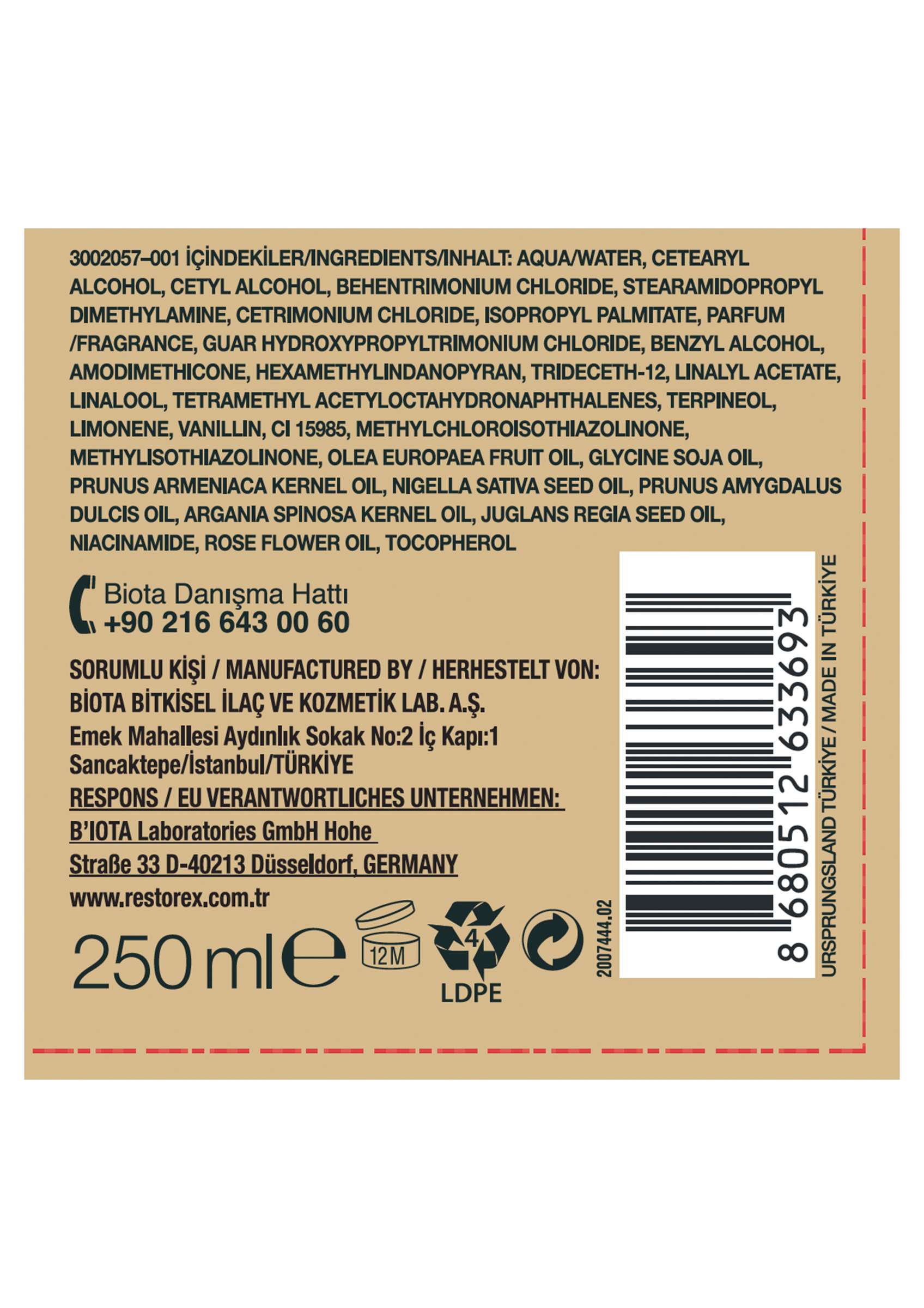 Aqua (Water), Cetearyl Alcohol, Cetyl Alcohol, Behentrimonium Chloride, Stearamidopropyl Dimethylamine, Cetrimonium Chloride, Isopropyl Palmitate, Parfum (Fragrance), Guar Hydroxypropyltrimonium Chloride, Benzyl Alcohol, Amodimethicone, Hexamethylindanopyran, Trideceth-12, Linalyl Acetate, Linalool, Tetramethyl Acetyloctahydronaphthalenes, Terpineol, Limonene, Vanillin, CI 15985, Methylchloroisothiazolinone, Methylisothiazolinone, Olea Europaea (Olive) Fruit Oil, Glycine Soja (Soybean) Oil, Prunus Armeniaca (Apricot) Kernel Oil, Nigella Sativa (Black Cumin) Seed Oil, Prunus Amygdalus Dulcis (Sweet Almond) Oil, Argania Spinosa (Argan) Kernel Oil, Juglans Regia (Walnut) Seed Oil, Niacinamide, Rose Flower Oil, Tocopherol.