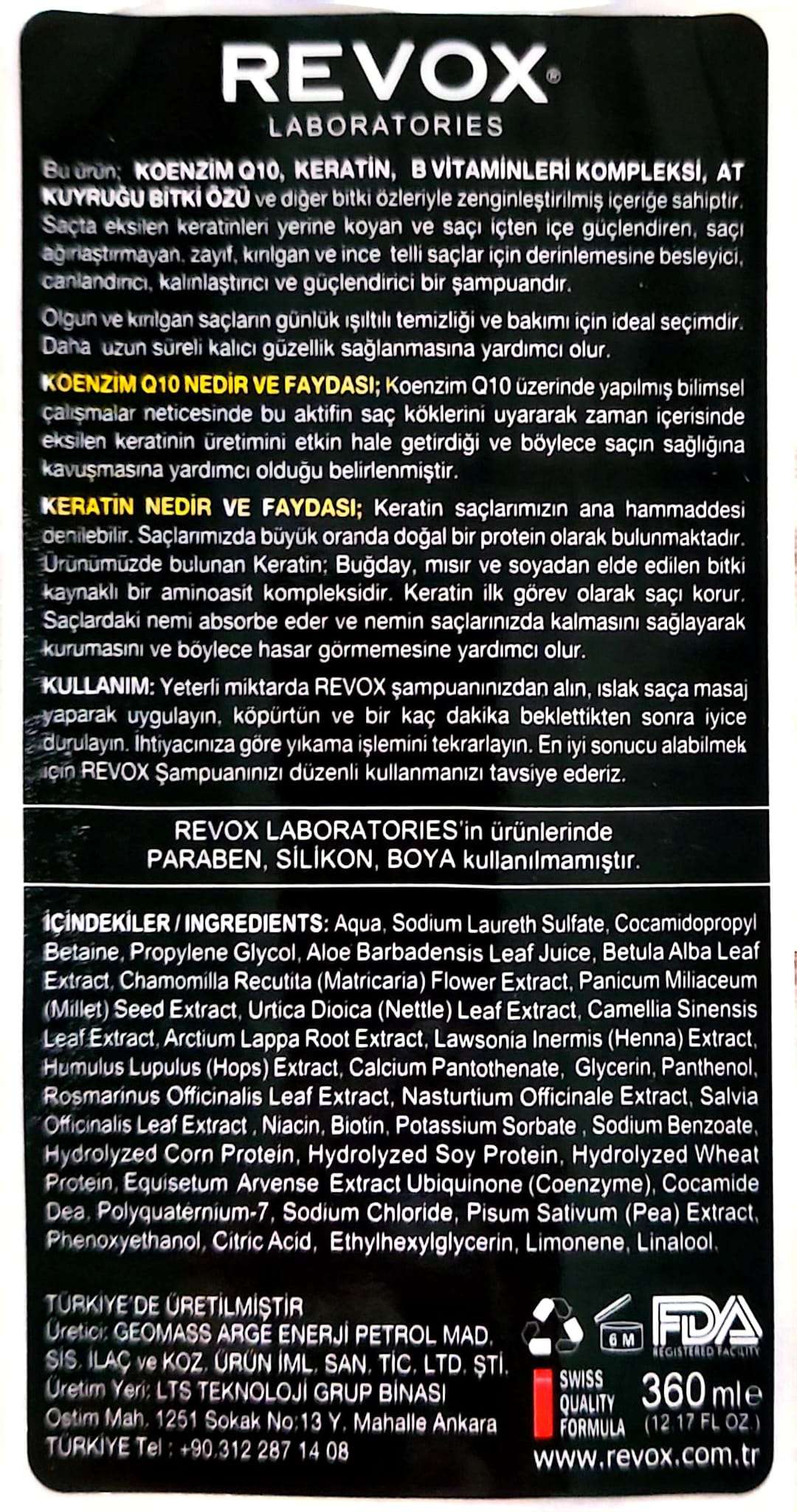 Revox Zayıf, Kırılgan ve İnce Tellİ Saçlar İçin Derin Besleyici Şampuan Koenzim Q10 & Keratin & B Vitamin Kompleksi Aktif İçeriklerin Etkileri