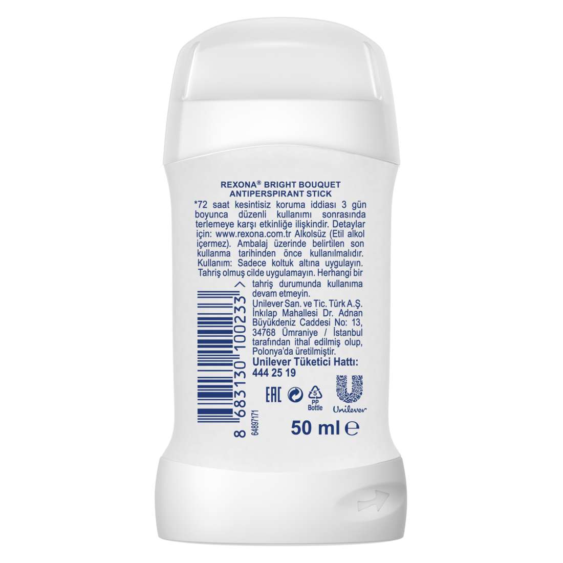 Gün boyu aktif bir yaşam mı sürüyorsunuz? Koşuşturmaca içinde kendinizi hep taze ve güvende hissetmek mi istiyorsunuz? O zaman sizin için doğru seçim: Rexona Bright Bouquet Stick! Vücut ısısıyla aktifleşen Rexona ıslaklık ve ter kokusuna karşı 72 saat* kesintisiz koruma sağlar. Üstelik çiçeksi kokusuyla sizi yalnızca ferah değil, aynı zamanda zarif de hissettirir.